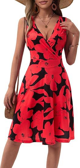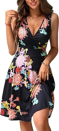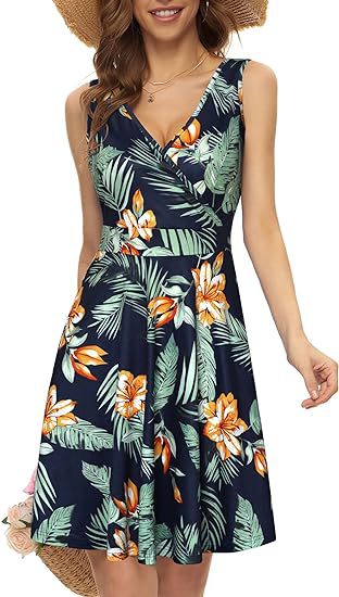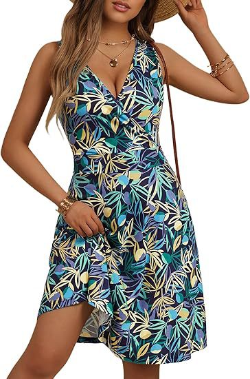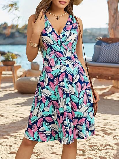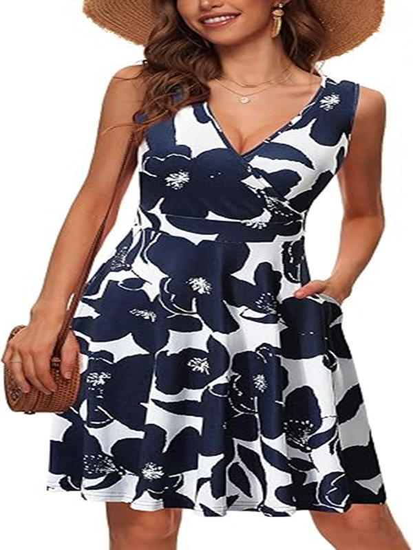 2025春夏新款欧美亚马逊优雅V领时尚印花口袋无袖连衣裙