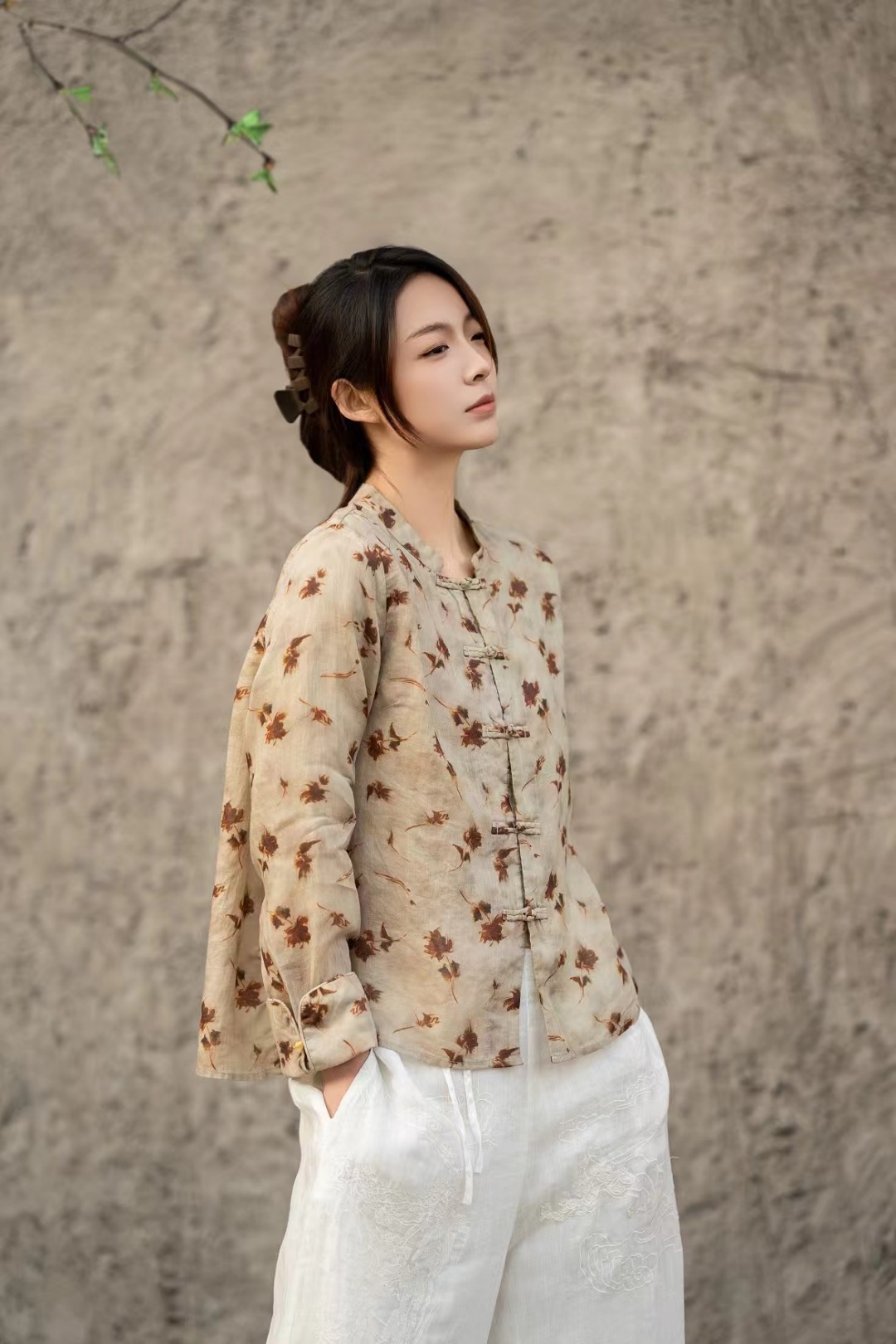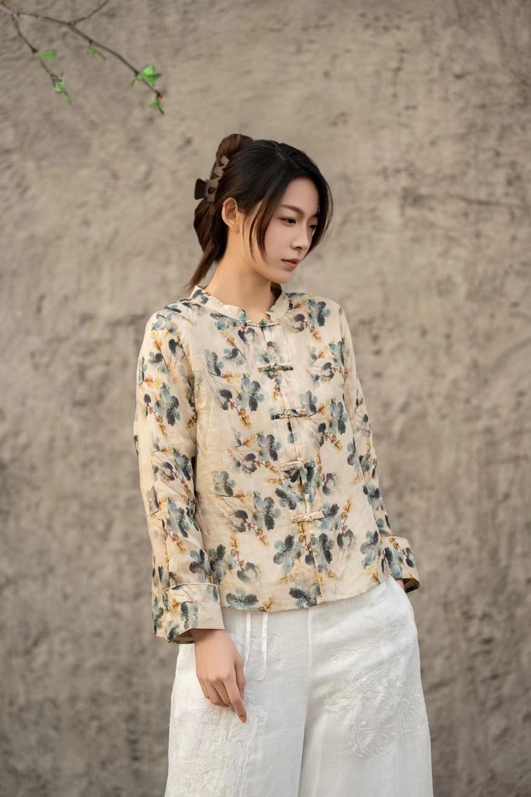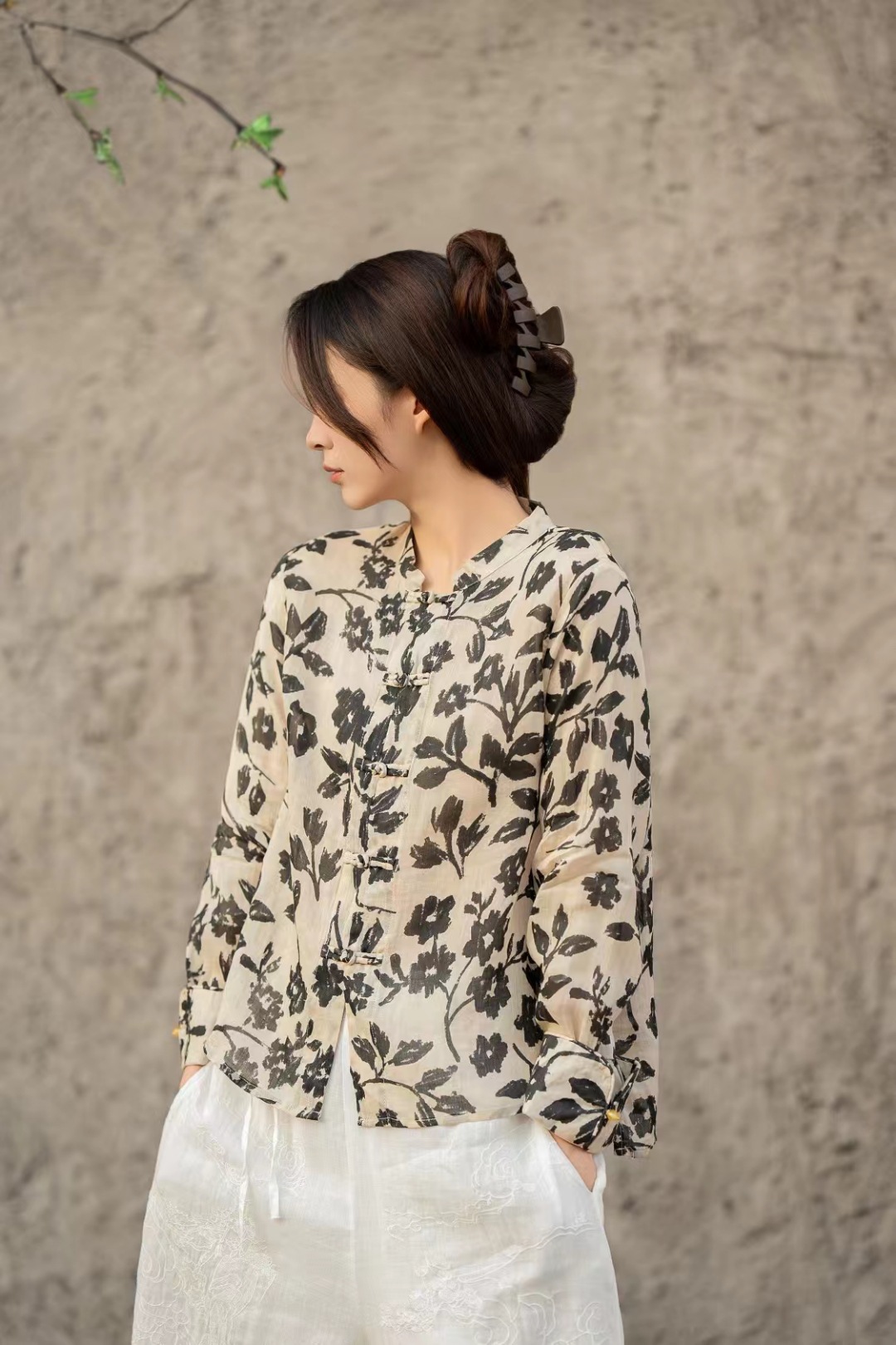 2025 봄과 여름 새로운 도착 프린트 셔츠 여성의 예술적 패션 칼라 긴팔 느슨한 버클 셔츠스토어 가기