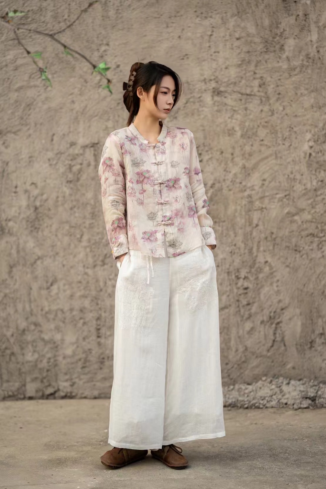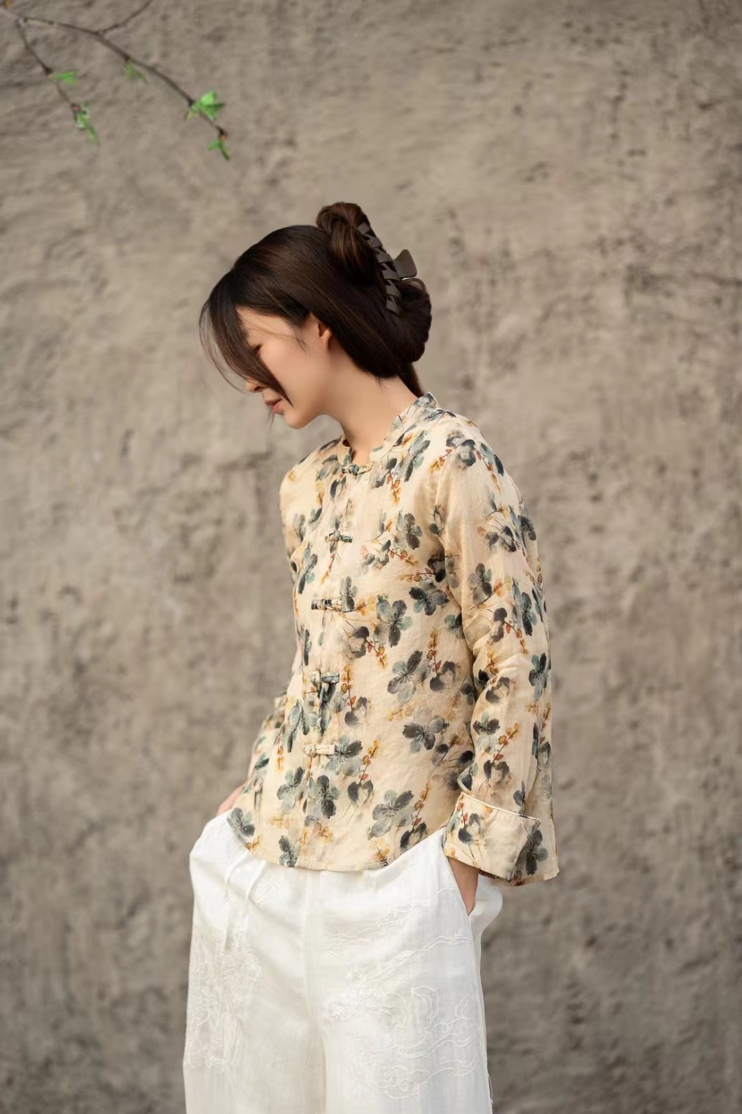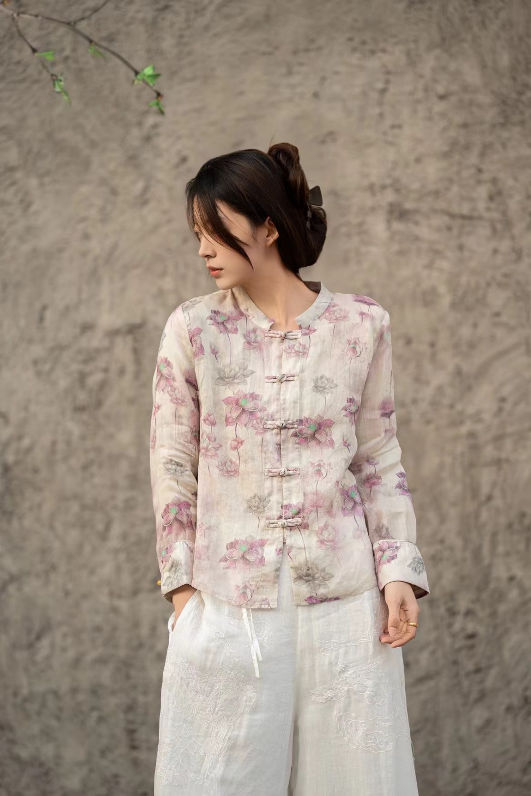 2025 봄과 여름 새로운 도착 프린트 셔츠 여성의 예술적 패션 칼라 긴팔 느슨한 버클 셔츠