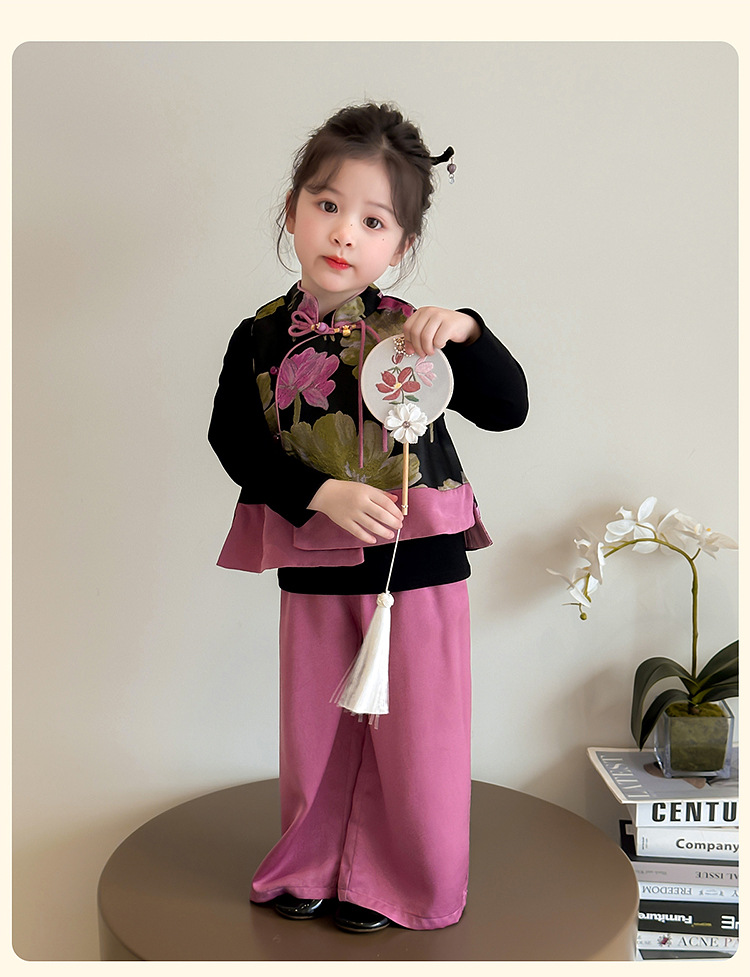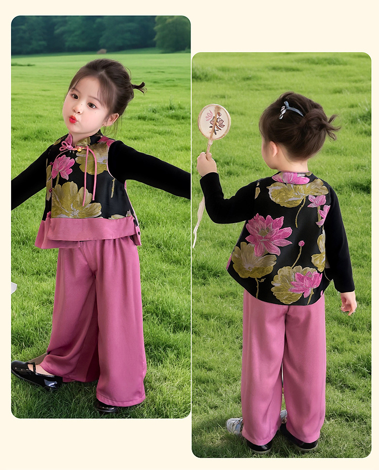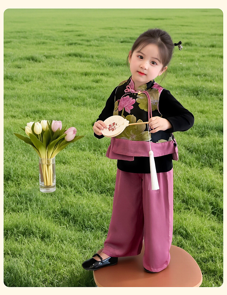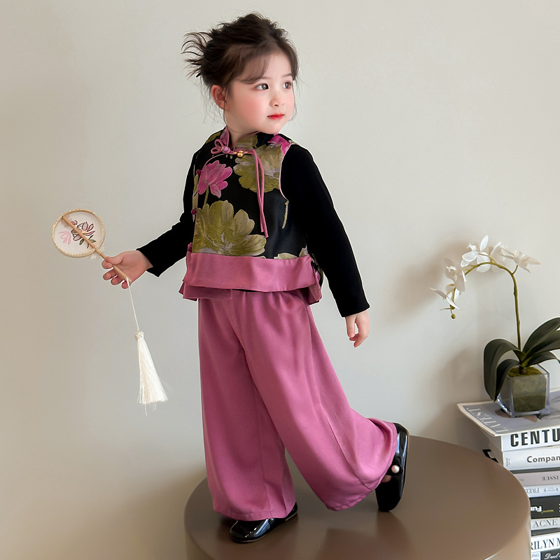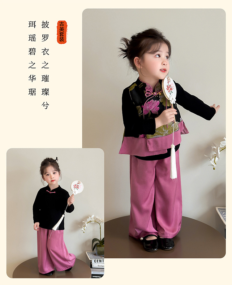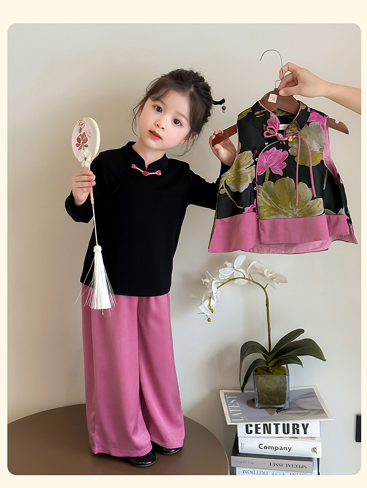 2025 새로운 소녀의 봄과 가을 중국 스타일 골동품 세트 소녀의 어린이 긴 소매 최고 조끼 3 조각 세트