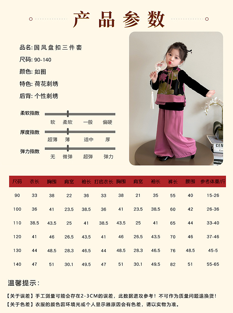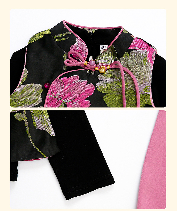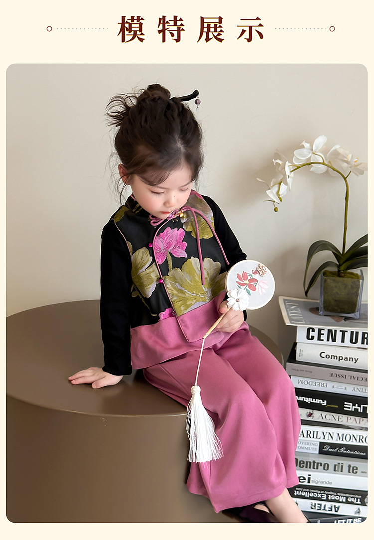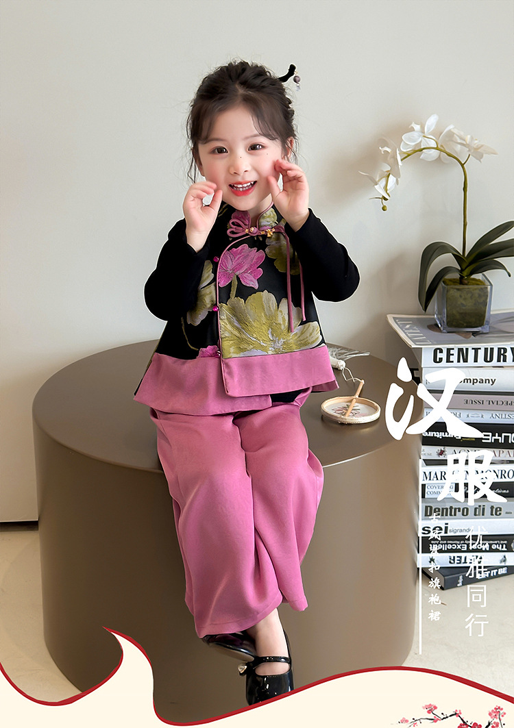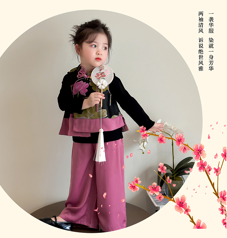 2025 새로운 소녀의 봄과 가을 중국 스타일 골동품 세트 소녀의 어린이 긴 소매 최고 조끼 3 조각 세트