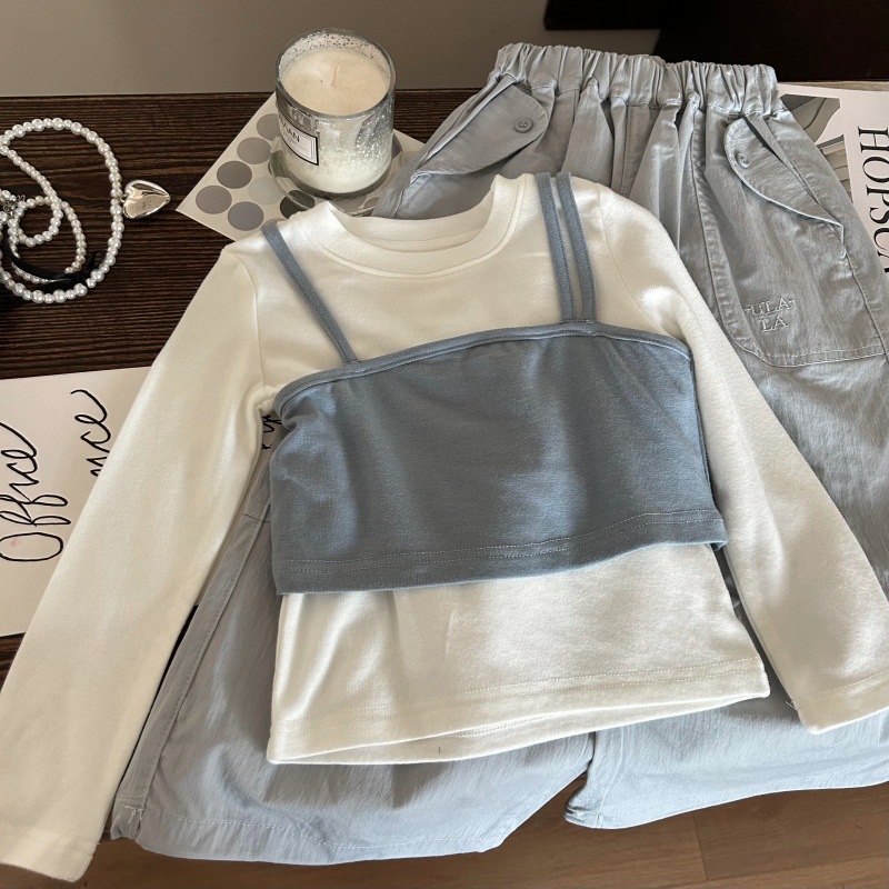 한국 아동복 2025 새 봄 소녀 대비 컬러 가짜 투피스 바닥 셔츠 어린이 캐주얼 바지 투피스 세트