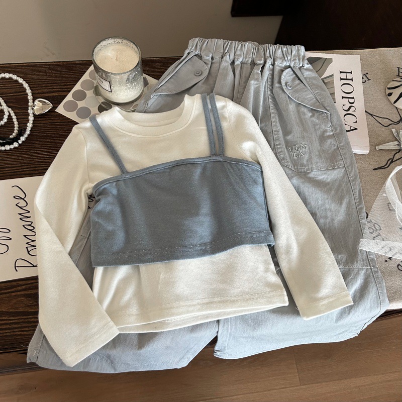 한국 아동복 2025 새 봄 소녀 대비 컬러 가짜 투피스 바닥 셔츠 어린이 캐주얼 바지 투피스 세트스토어 가기