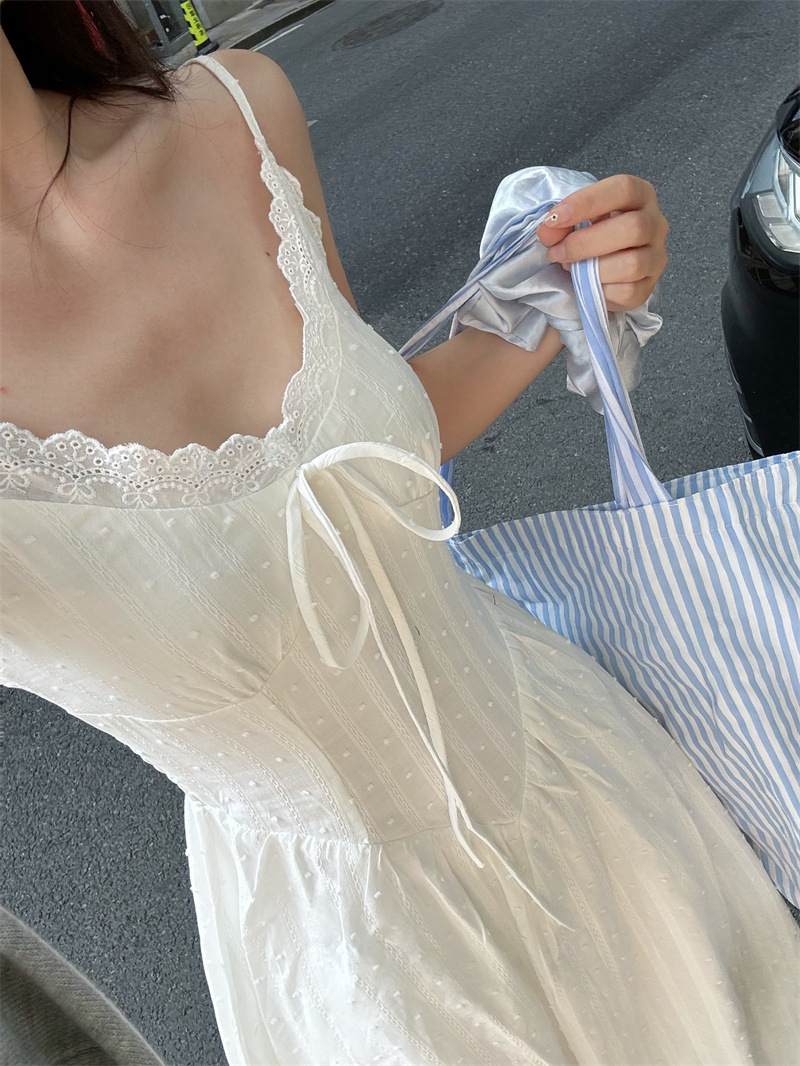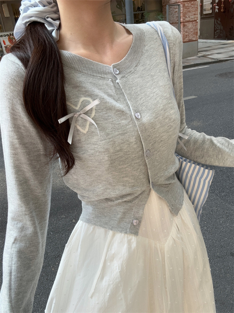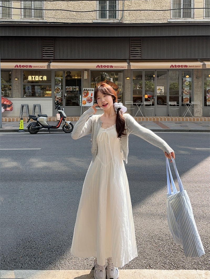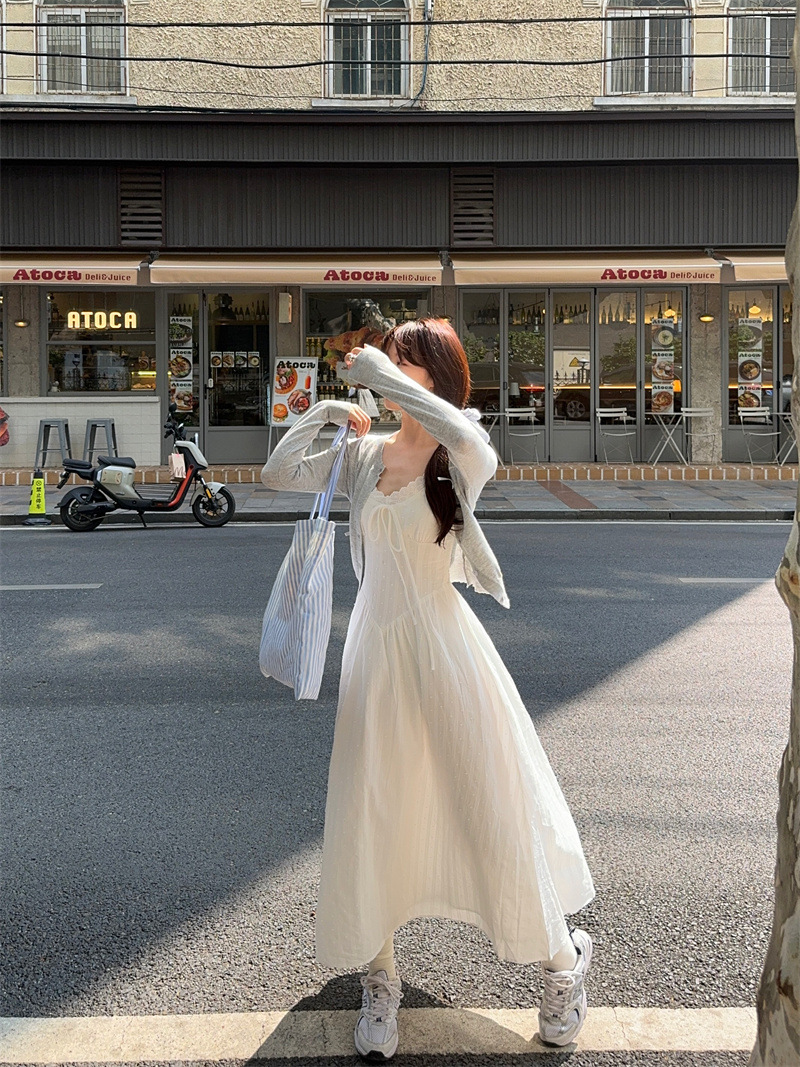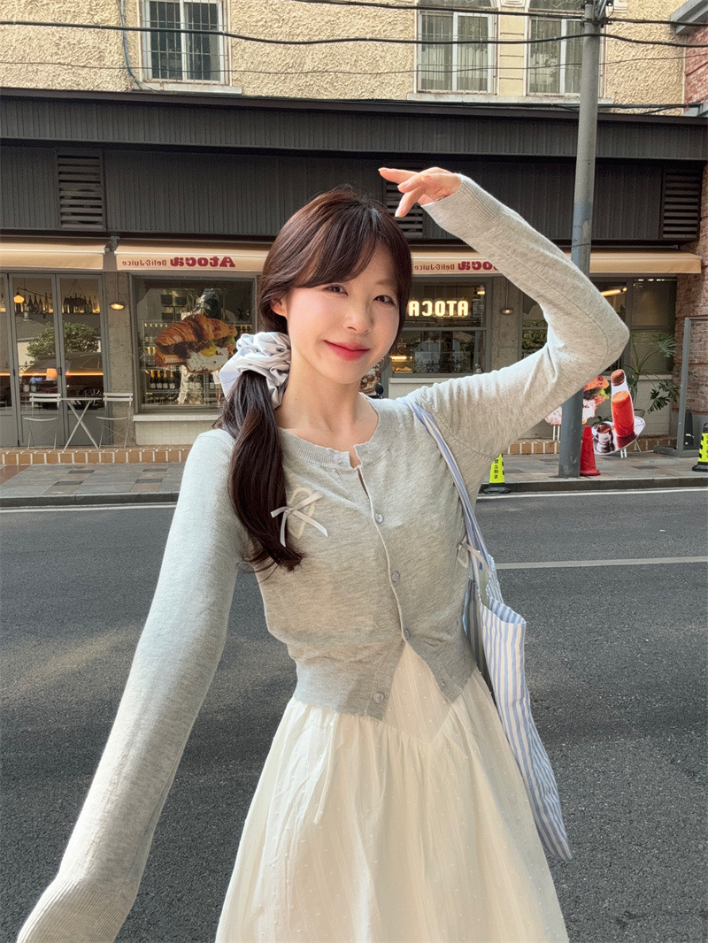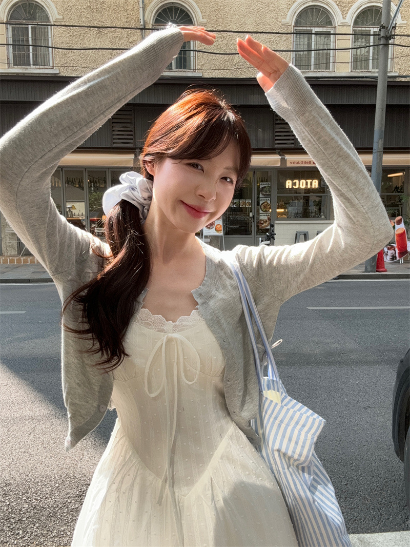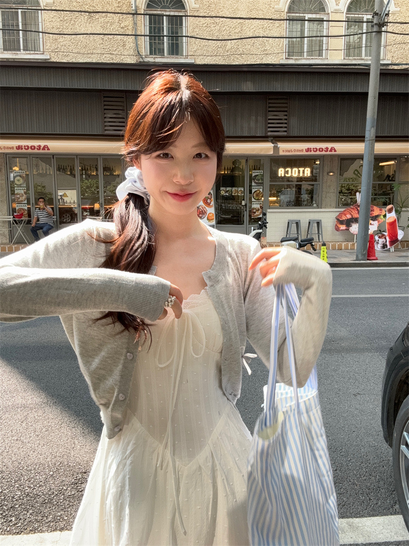 리얼 샷 프렌치 젠틀 스타일 달콤한 활 니트 카디건 여성 자수 자카드 슬립 스커트 화이트 스커트 77155