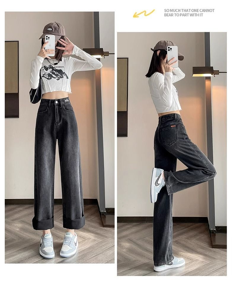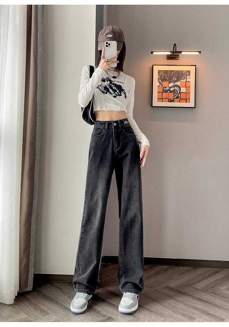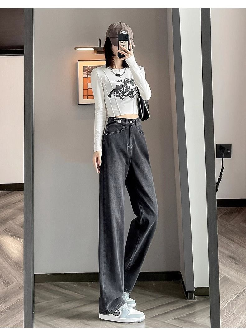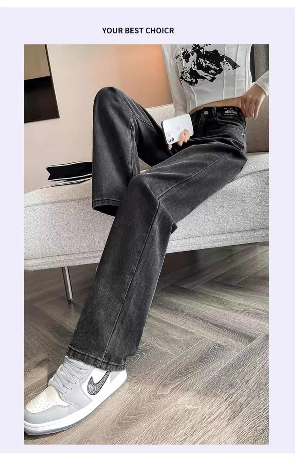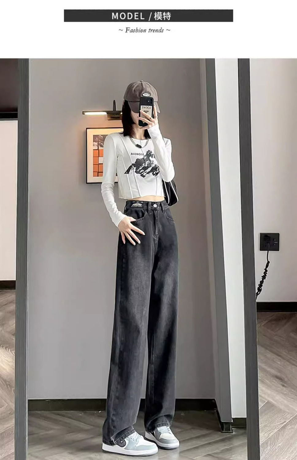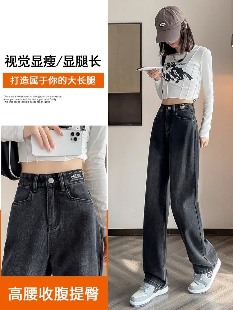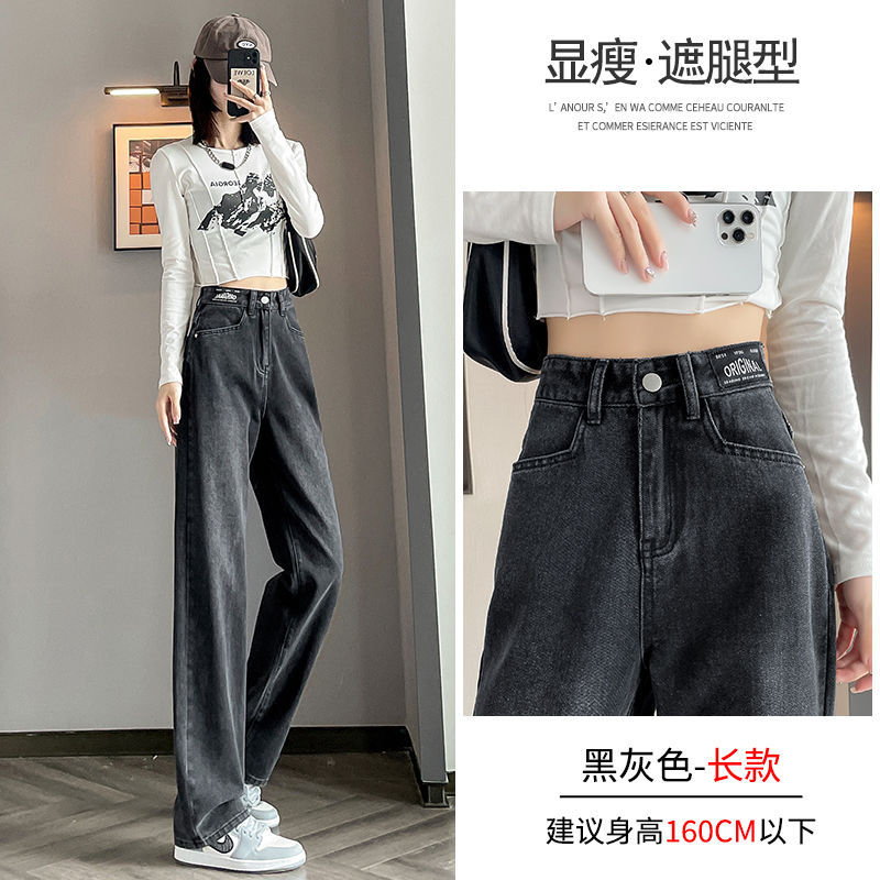 블랙 그레이 와이드 레그 청바지 여성용 스트레이트 느슨한 봄과 가을 새로운 레트로 하이 웨이스트 딥 롱 바지스토어 가기
