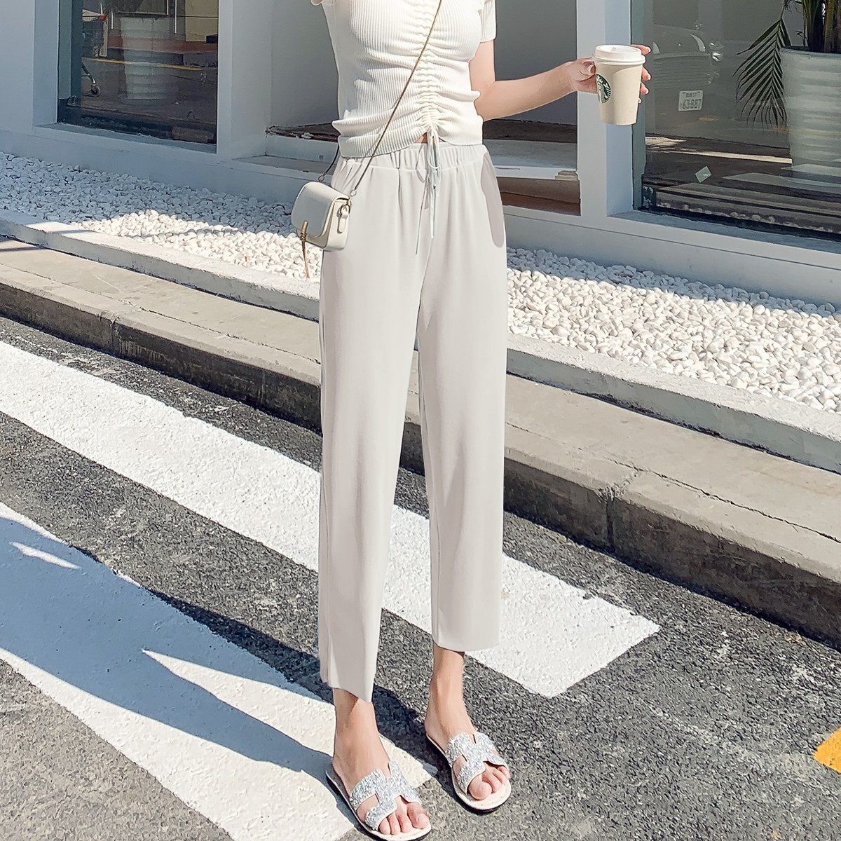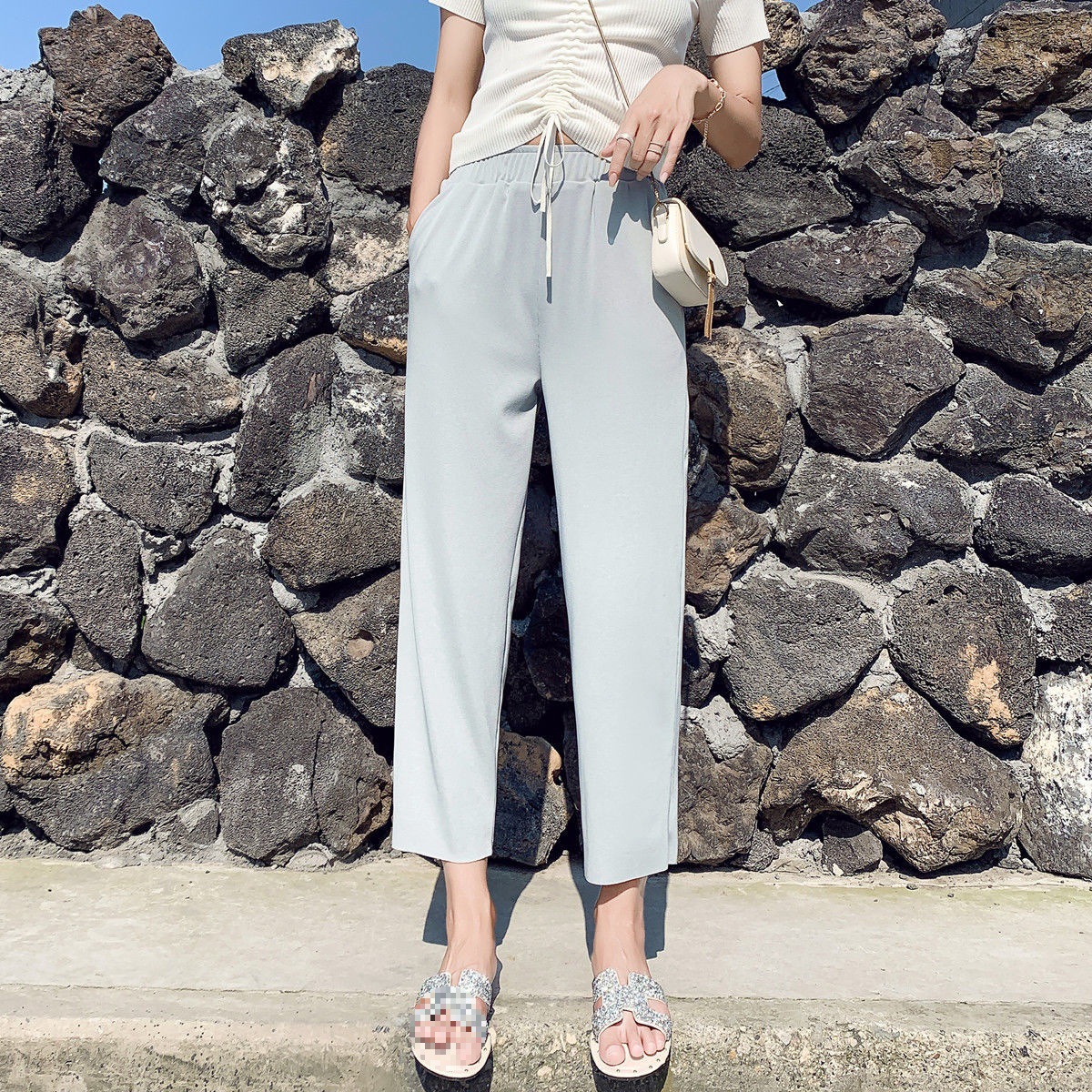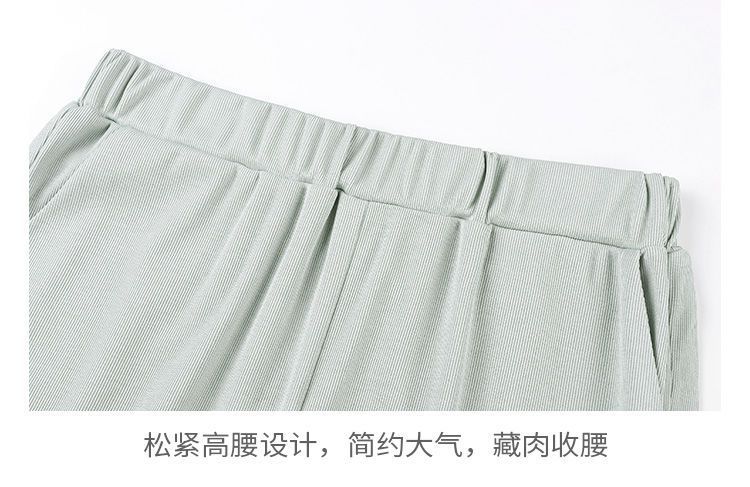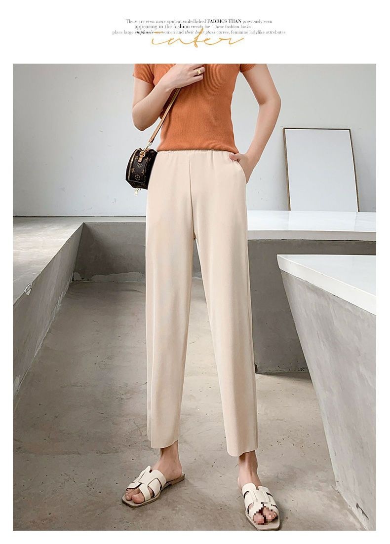 스트레이트 다리 바지 여성용 봄과 여름 캐주얼 새로운 얇은 자른 얼음 실크 드레이피 넓은 다리 할머니 자른 무 바지스토어 가기