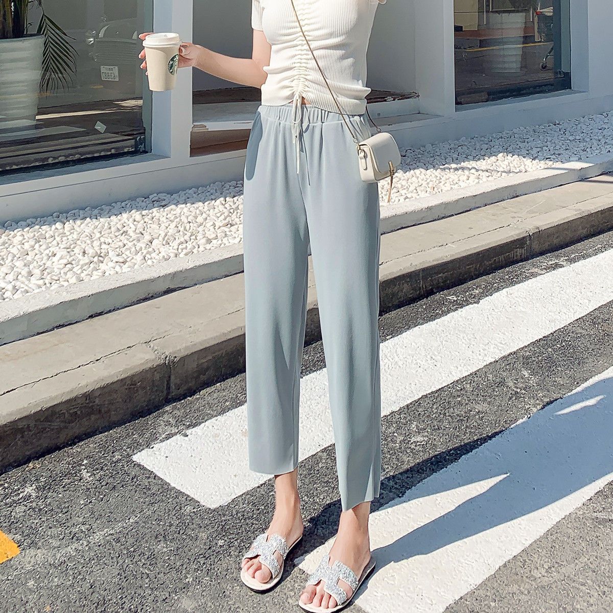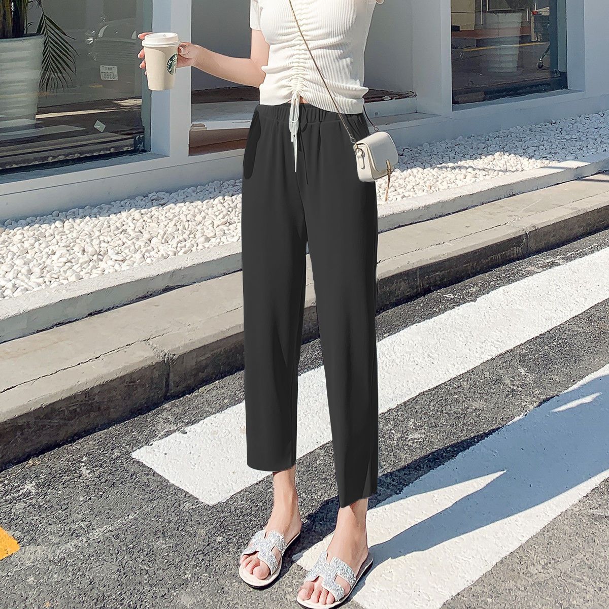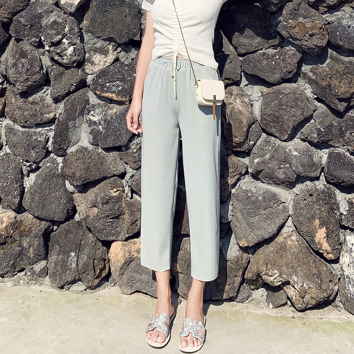 스트레이트 다리 바지 여성용 봄과 여름 캐주얼 새로운 얇은 자른 얼음 실크 드레이피 넓은 다리 할머니 자른 무 바지스토어 가기