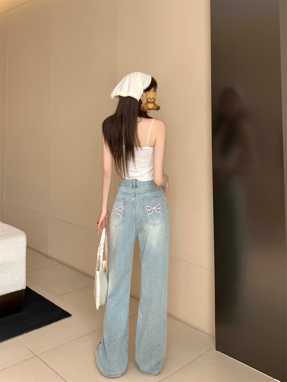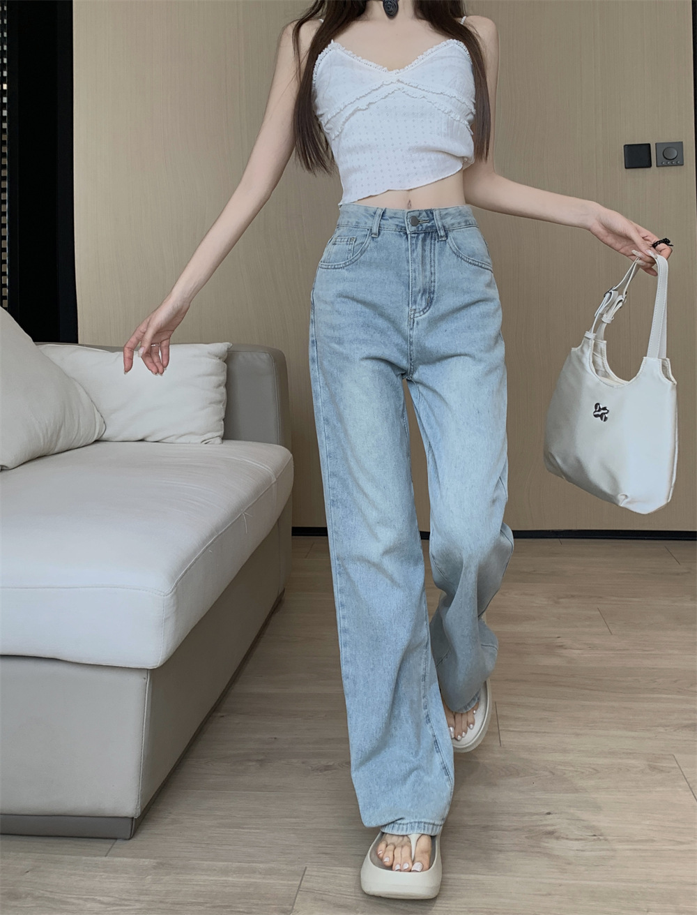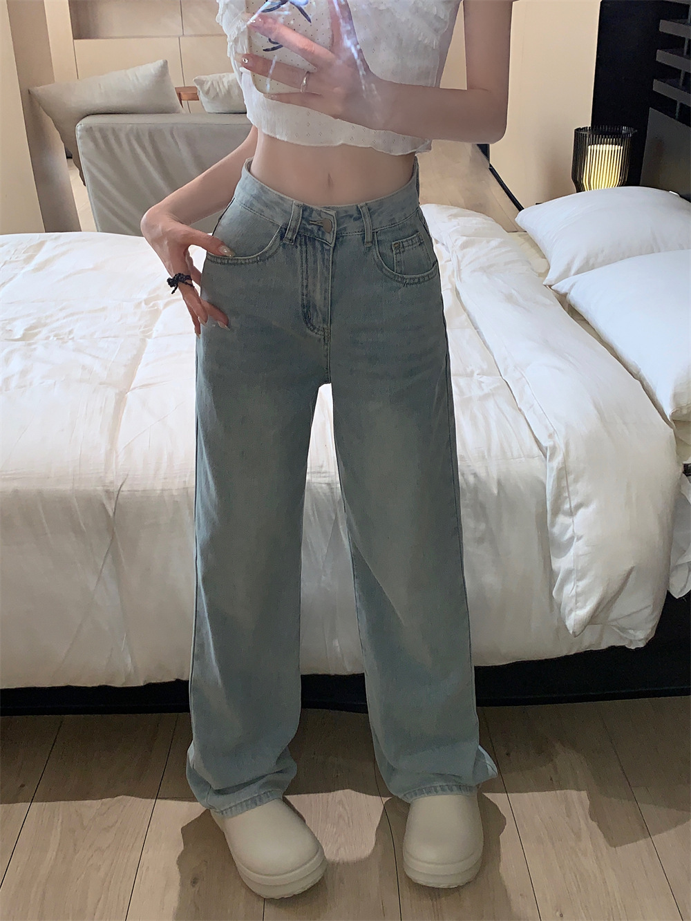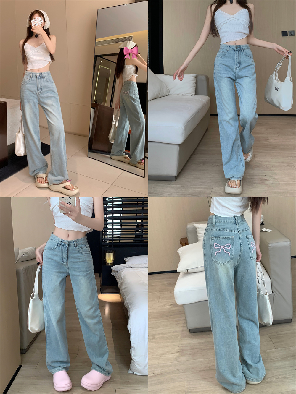 활 자수 높은 허리 스트레이트 청바지 여성의 2025 년 봄과 가을 새로운 느슨한 슬리밍 캐주얼 와이드 다리 바지스토어 가기