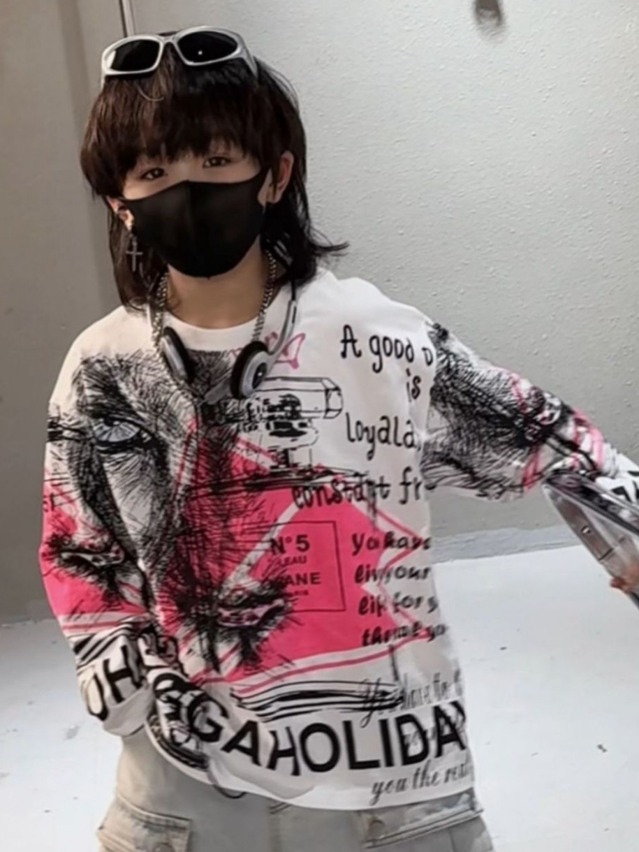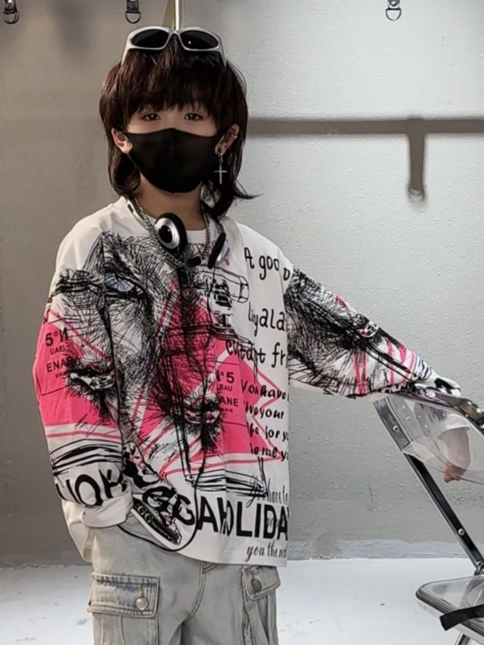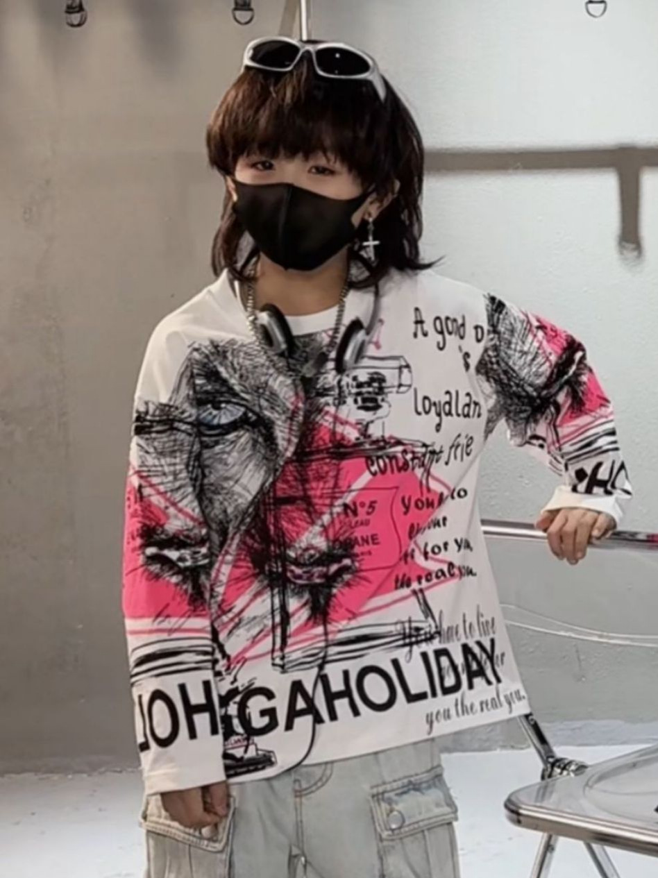 바오 콴 의류 어린이 느슨한 캐주얼 긴팔 티셔츠 트렌디 한 봄과 가을 여름 라운드 넥 인쇄 트렌디 한 쿨 탑스토어 가기