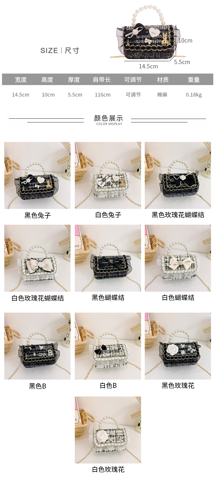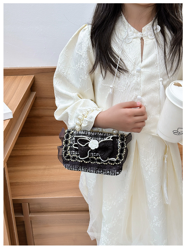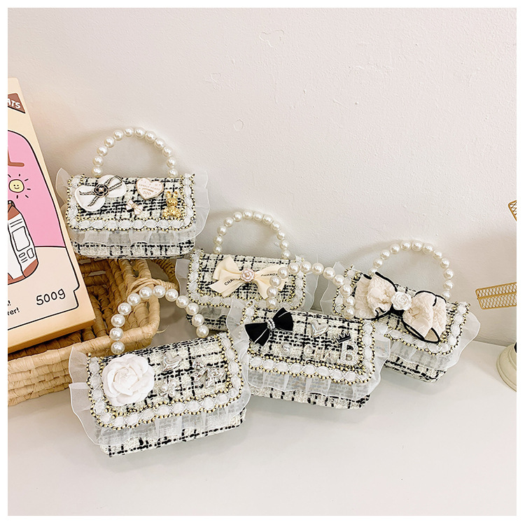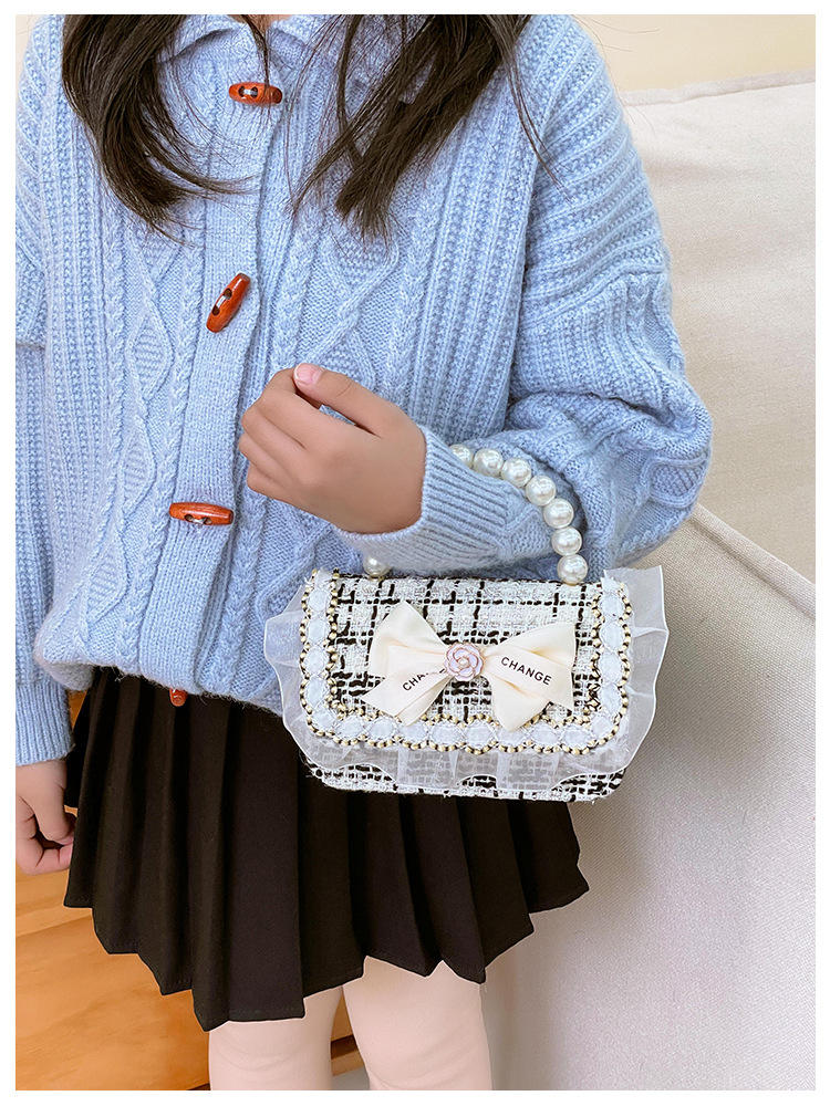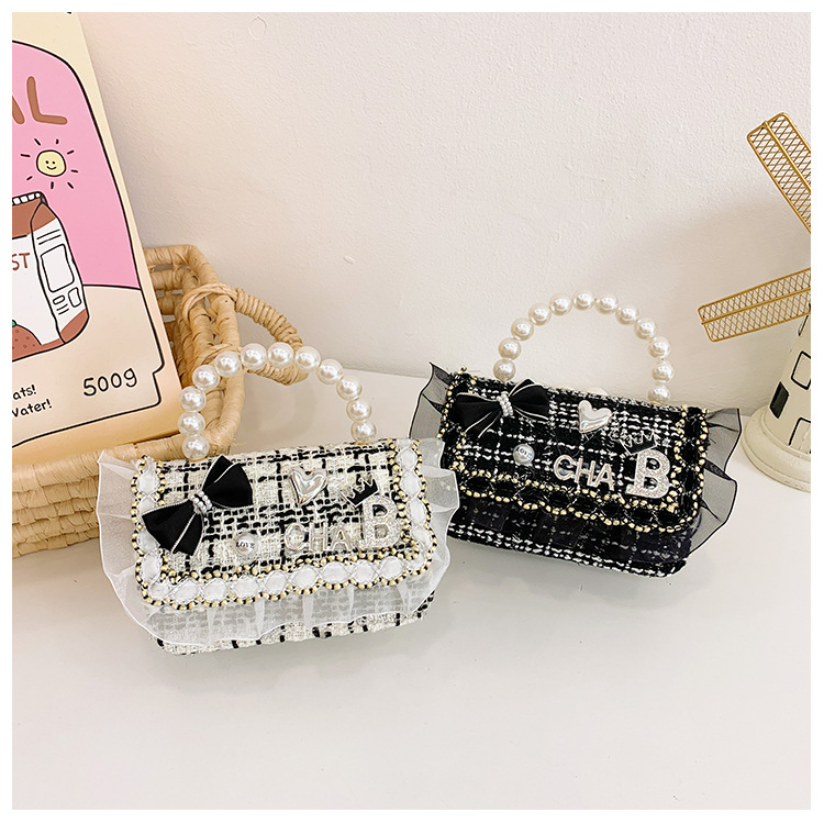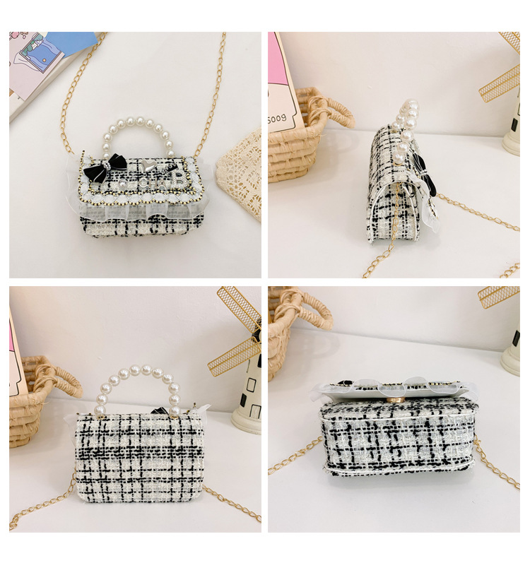 迷你时尚女童珍珠零钱包2024新格纹时尚韩版小女孩手提包童装搭配