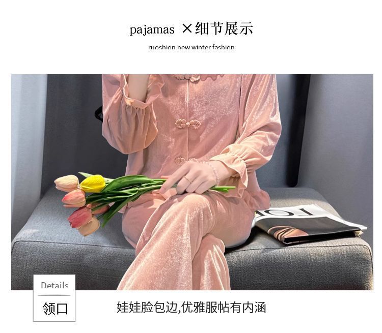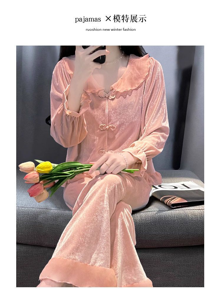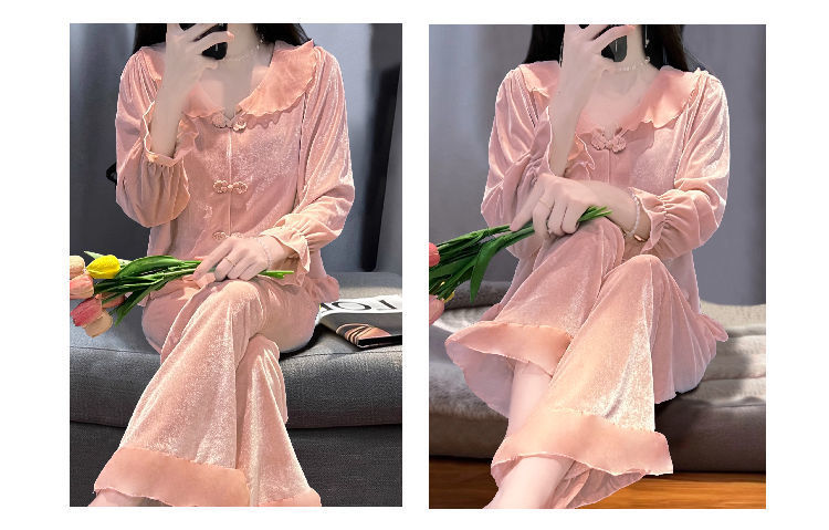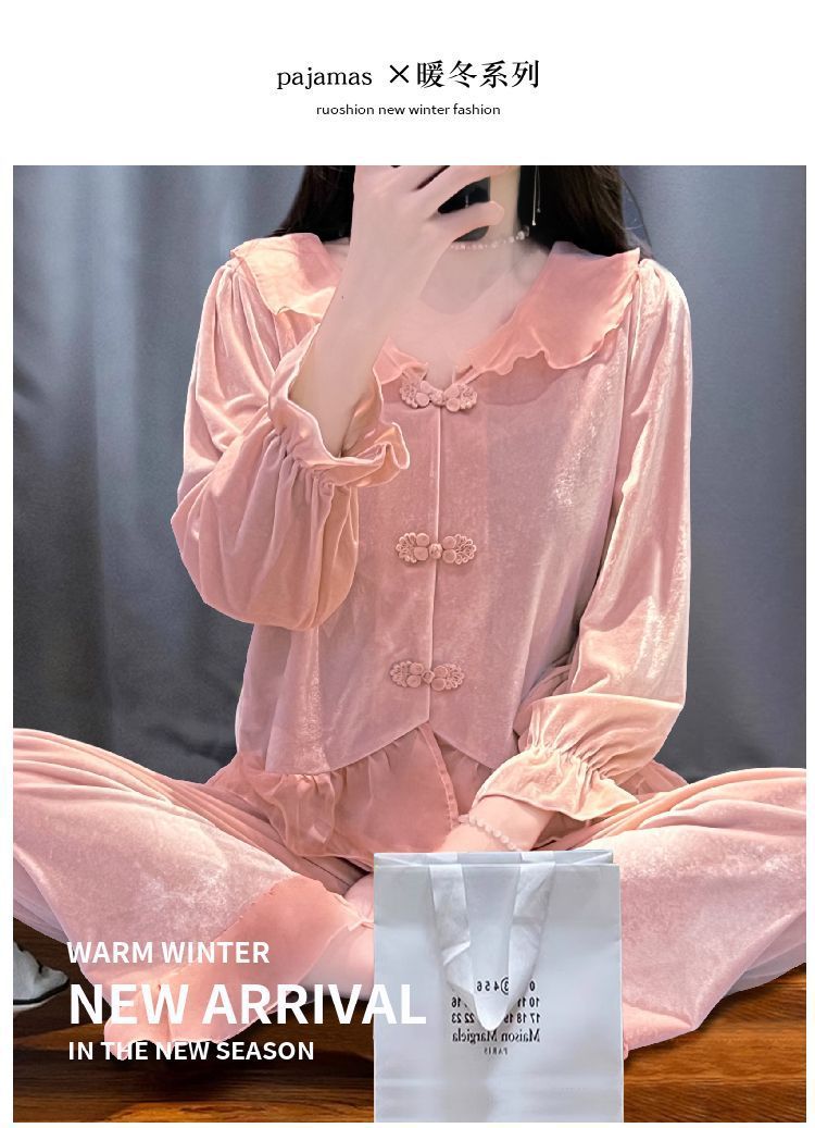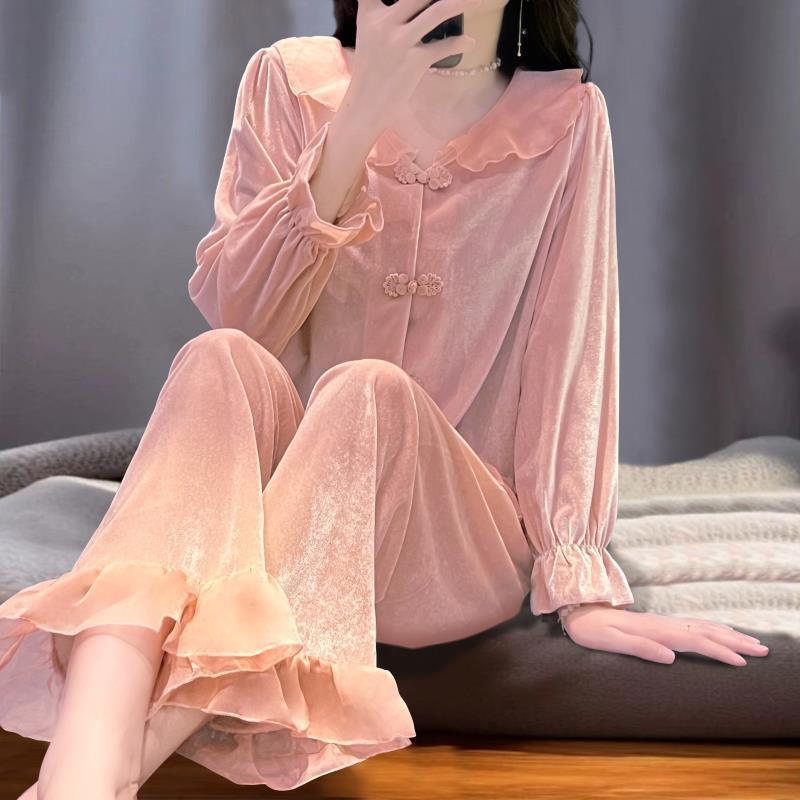 [1489 컬렉션] 잠옷 여성의 봄과 가을 황금 벨벳 작은 옷깃 달콤한 중국 스타일 버클 카디건 2 피스 세트