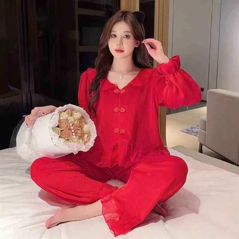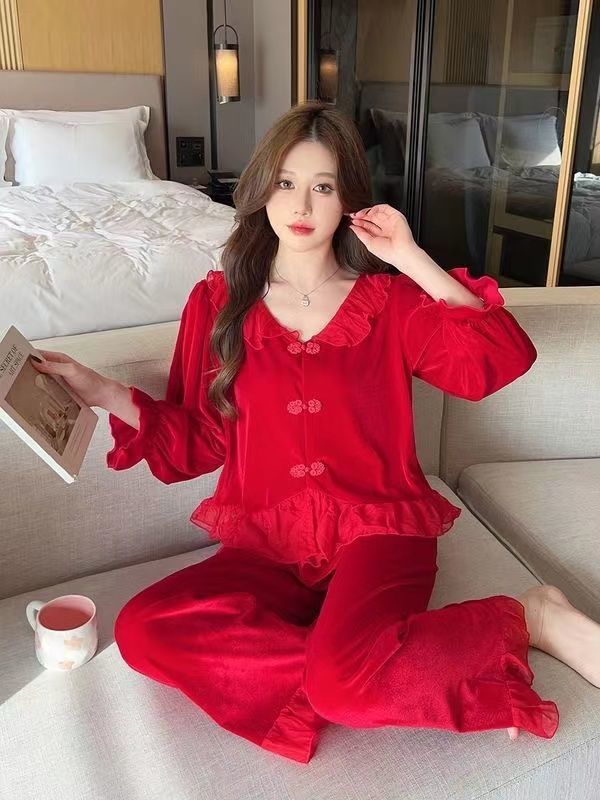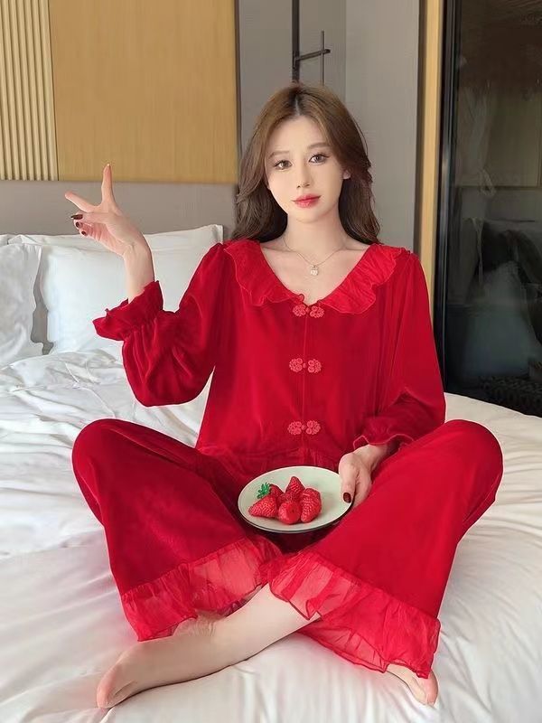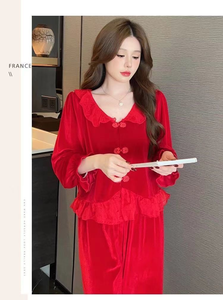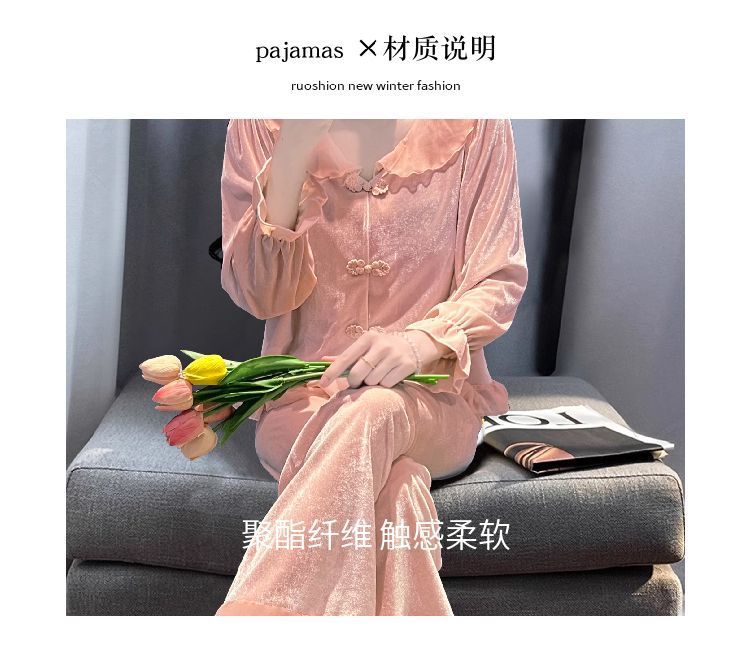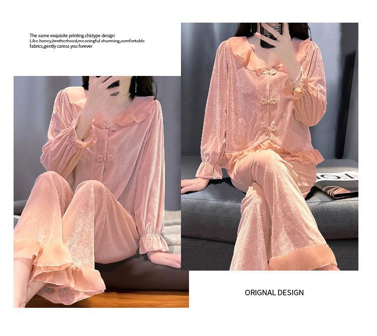 [1489 컬렉션] 잠옷 여성의 봄과 가을 황금 벨벳 작은 옷깃 달콤한 중국 스타일 버클 카디건 2 피스 세트