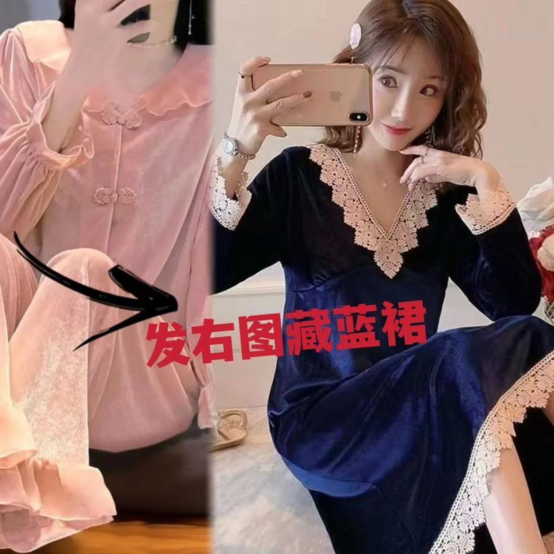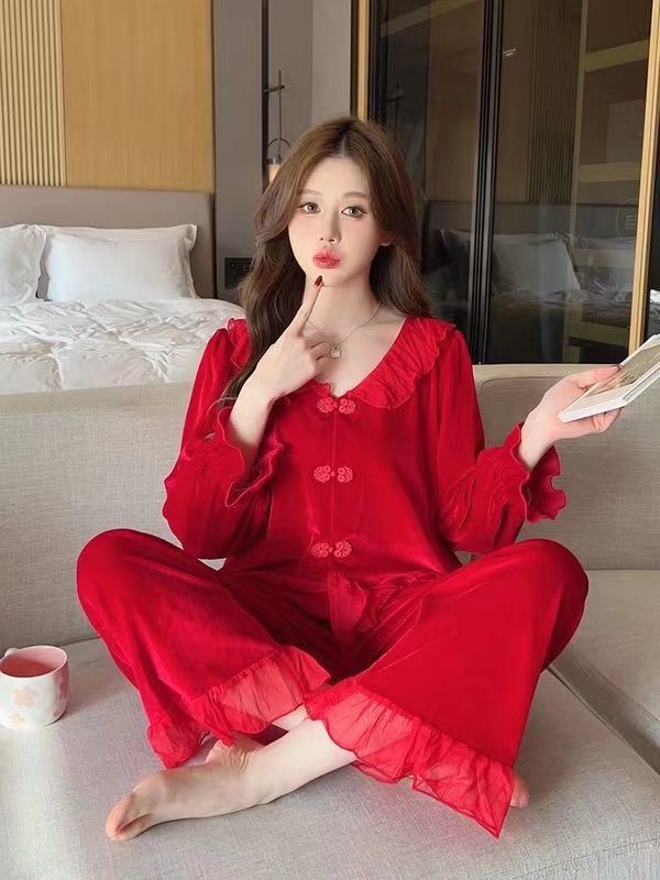 [1489 컬렉션] 잠옷 여성의 봄과 가을 황금 벨벳 작은 옷깃 달콤한 중국 스타일 버클 카디건 2 피스 세트스토어 가기