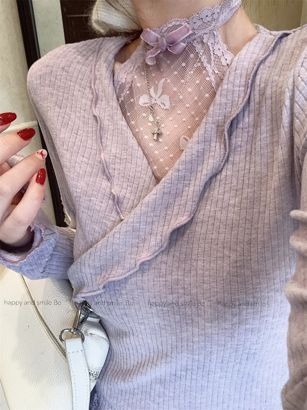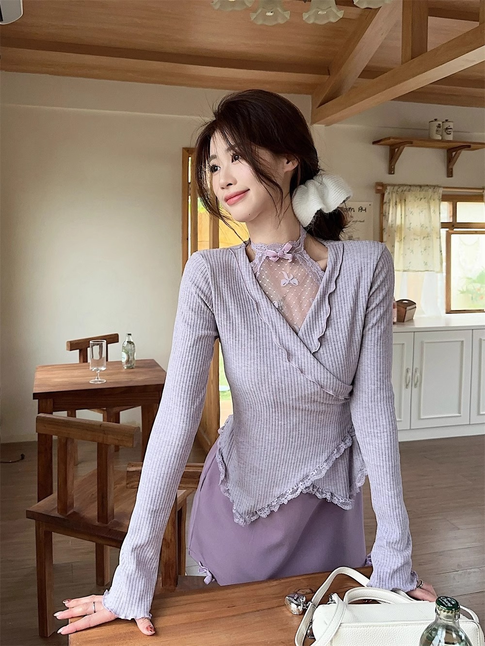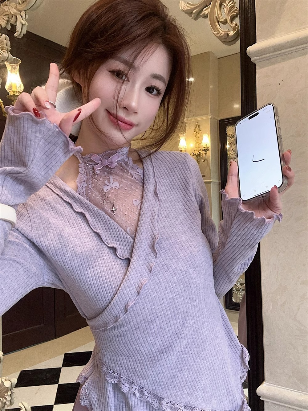 순수한 욕망 스타일 보라색 나무 귀 긴팔 최고 치마 세트 여성의 봄과 가을 달콤한 매운 스타일 세련된 투피스 세트