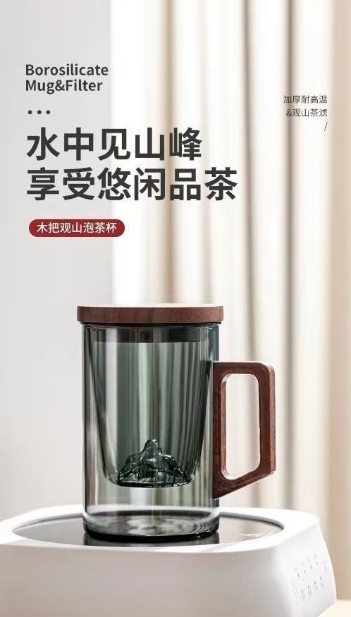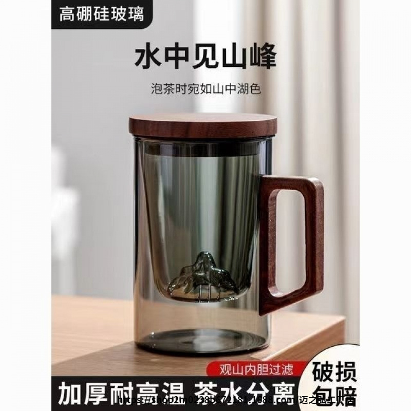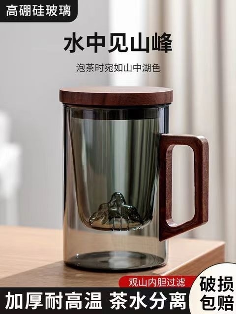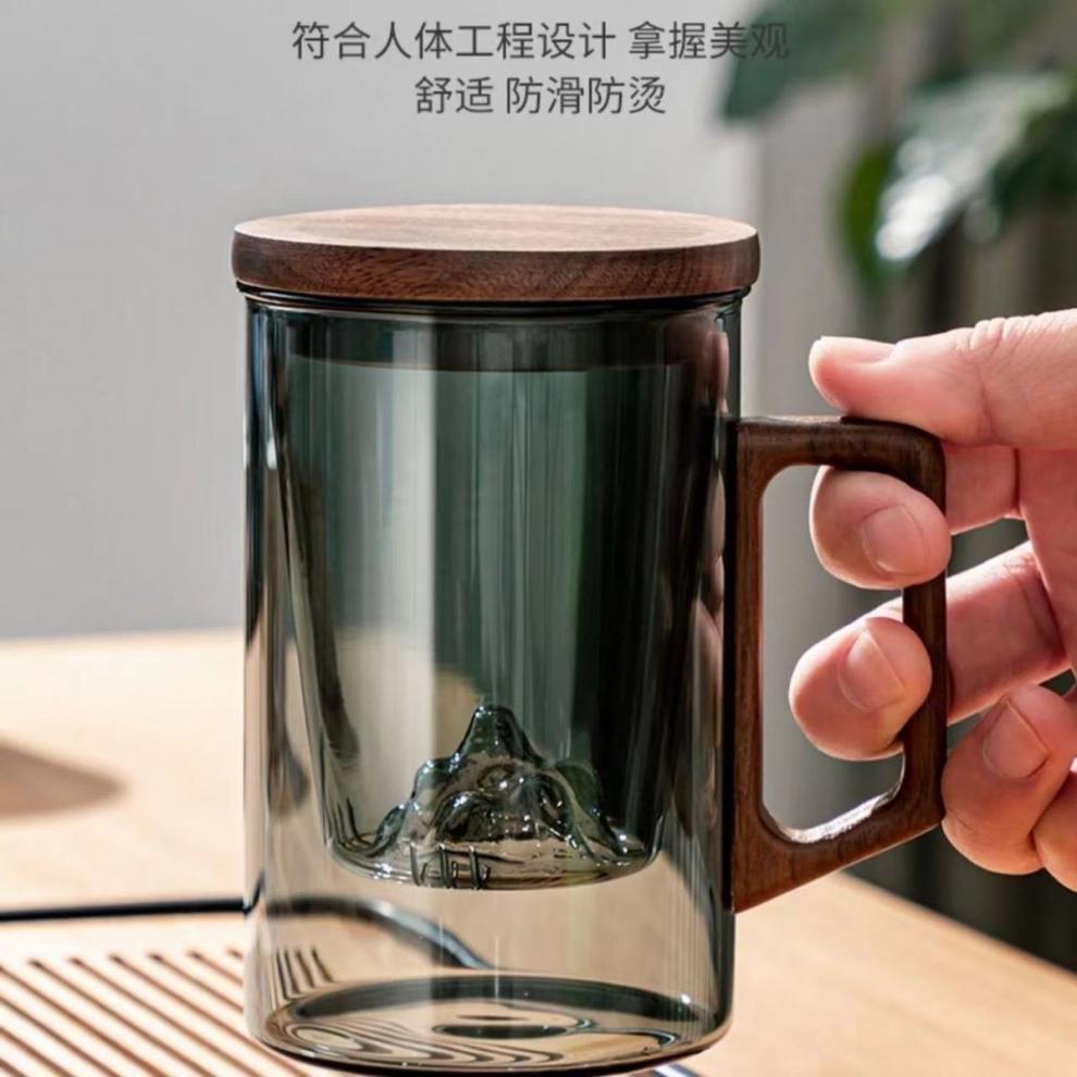 茶杯茶水分离高档杯玻璃观山水杯日式商务杯胡桃把手办公杯
