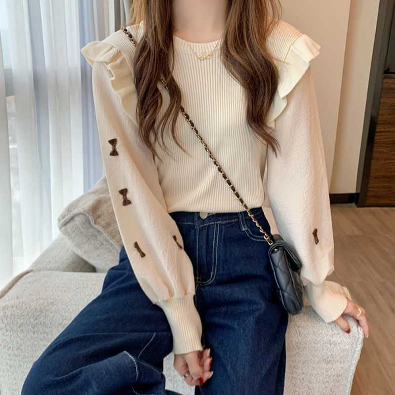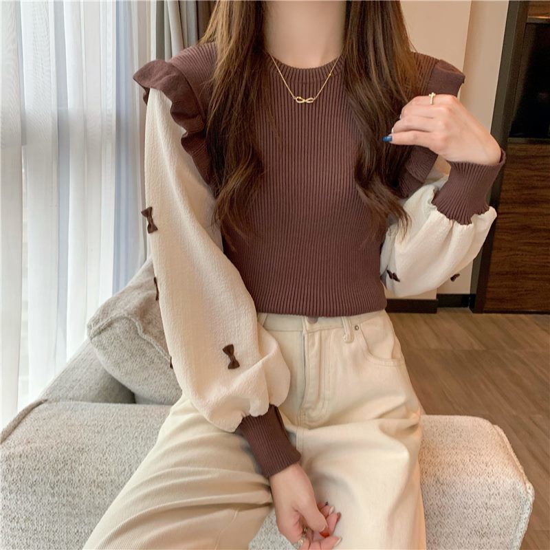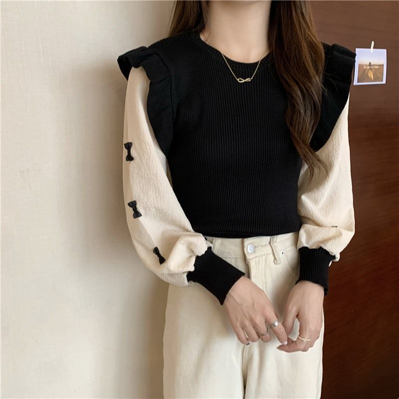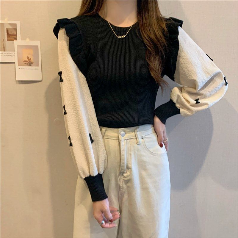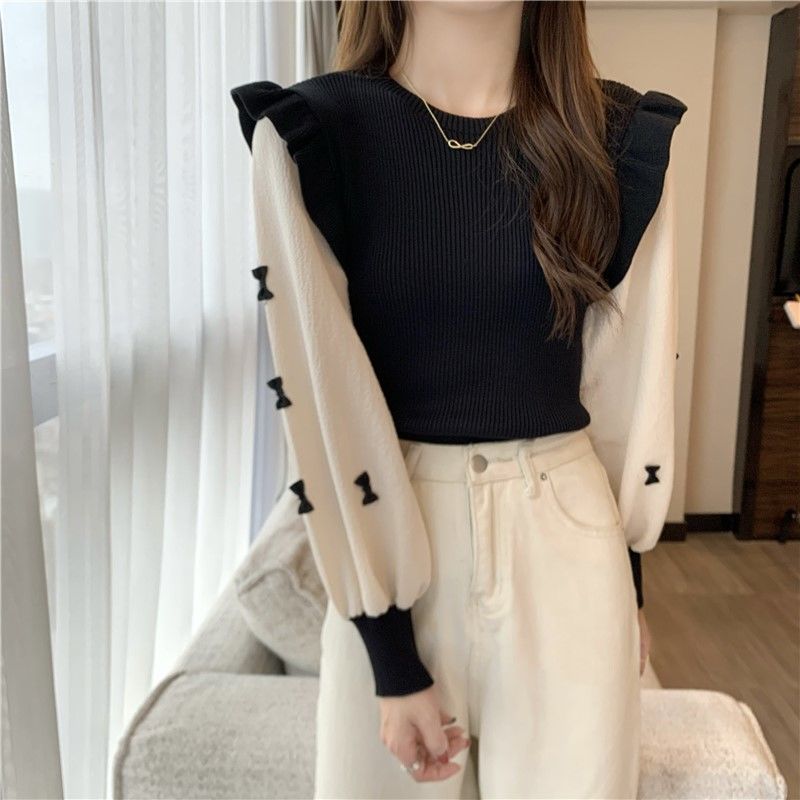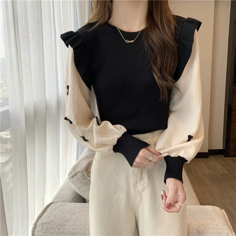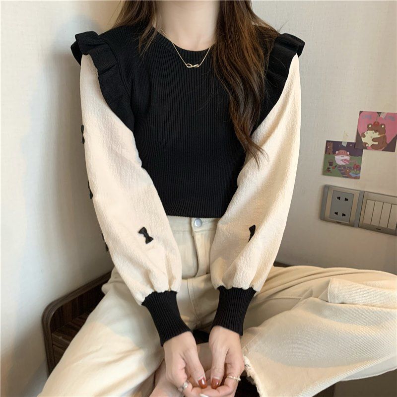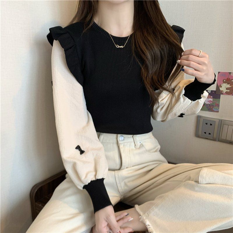 봄 2025 새로운 가짜 투피스 스웨터 여성용 활 바느질 긴팔 슬림 핏