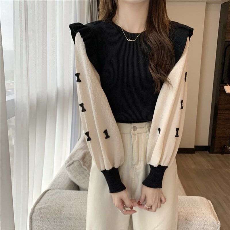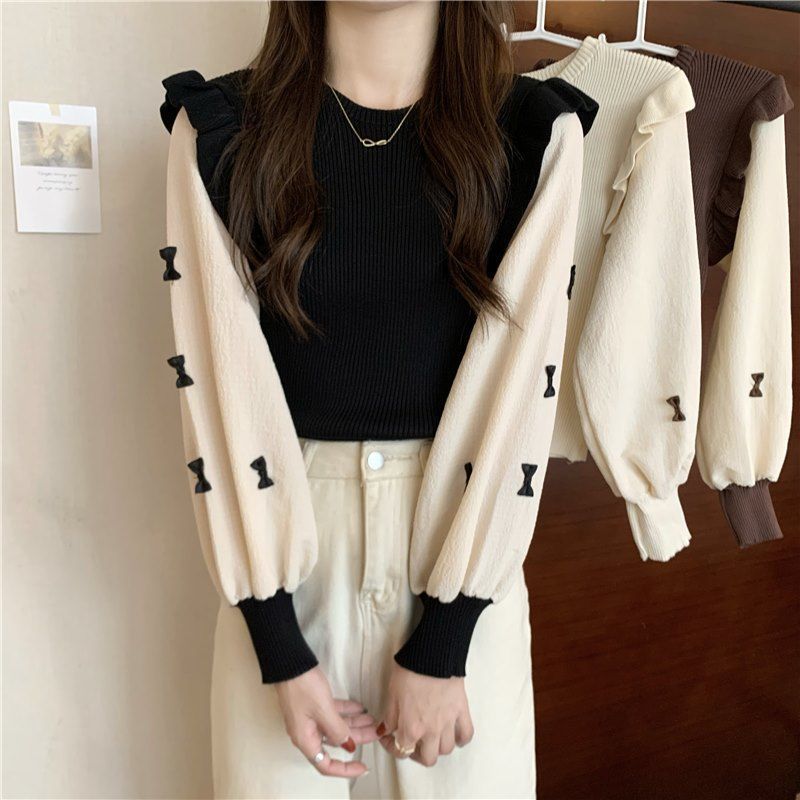 봄 2025 새로운 가짜 투피스 스웨터 여성용 활 바느질 긴팔 슬림 핏스토어 가기