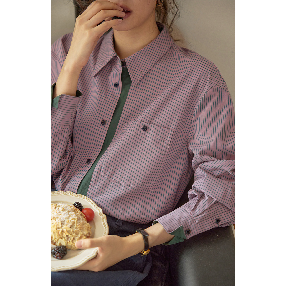 Solighte 프렌치 레트로 대비 색상 세로 줄무늬 셔츠 여성용 봄 2025 새로운 기모 긴팔 탑스토어 가기