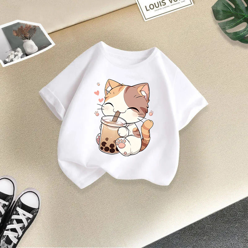 • 하얀 밀크티를 마시는 고양이 반팔