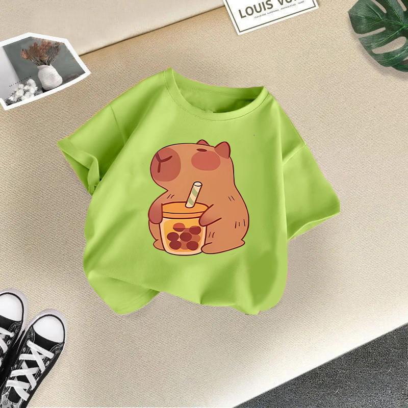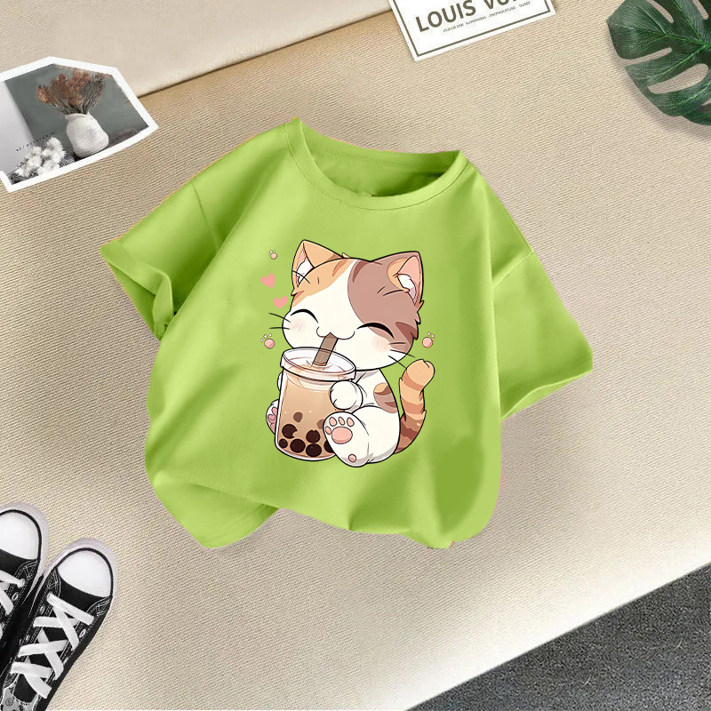 • 밀크티를 마시는 과일 녹색 고양이 반팔