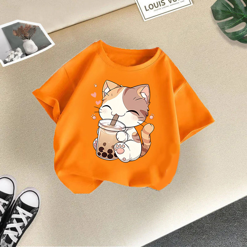 • 밀크티를 마시는 오렌지색 고양이 반팔