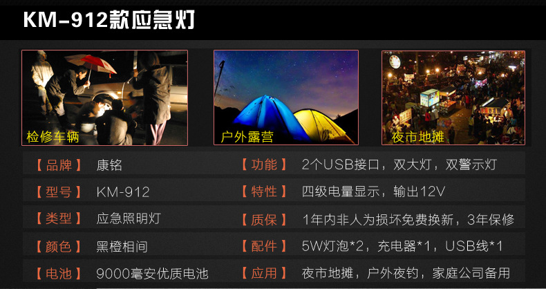 강밍 파워 비상 조명 홈 정전 조명 캠핑 텐트 태양 충전 야외 캠핑 KM-912
