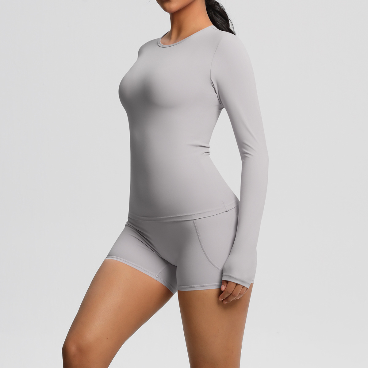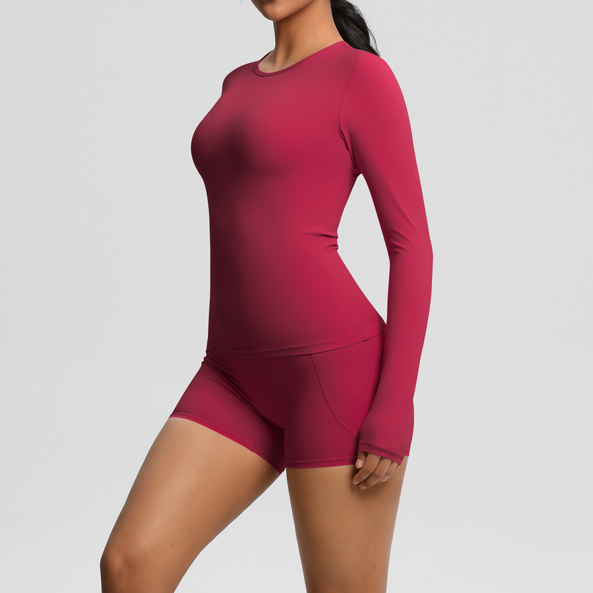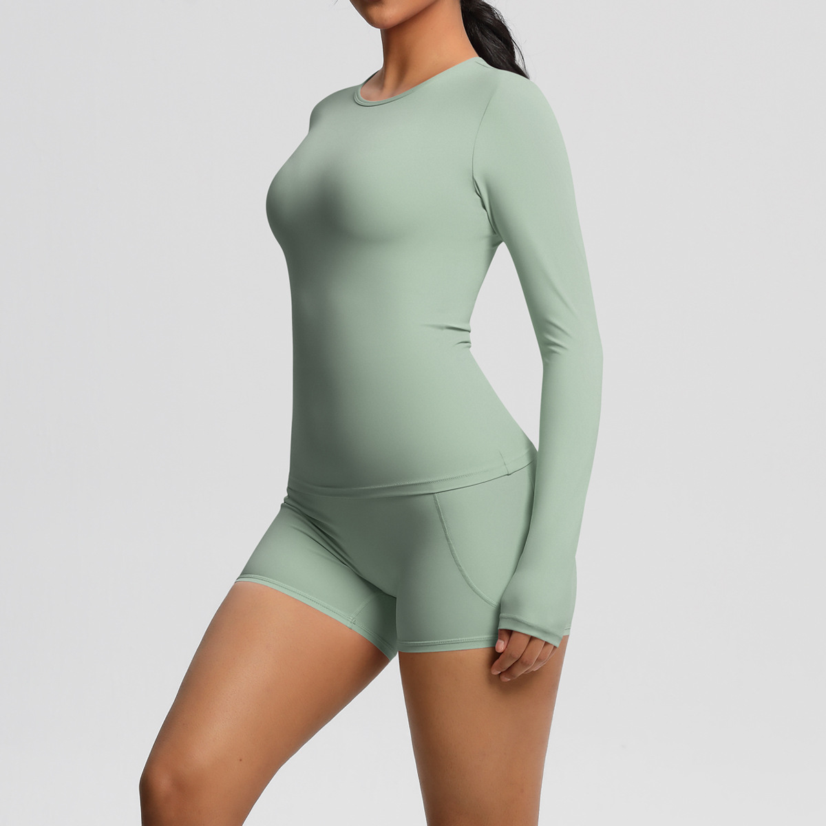 유럽과 미국의 단색 피부 친화적 인 샌딩 타이트 긴팔 요가 의류 세트 스포츠 반바지 달리기 피트니스 의류 투피스 세트