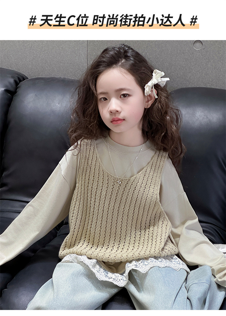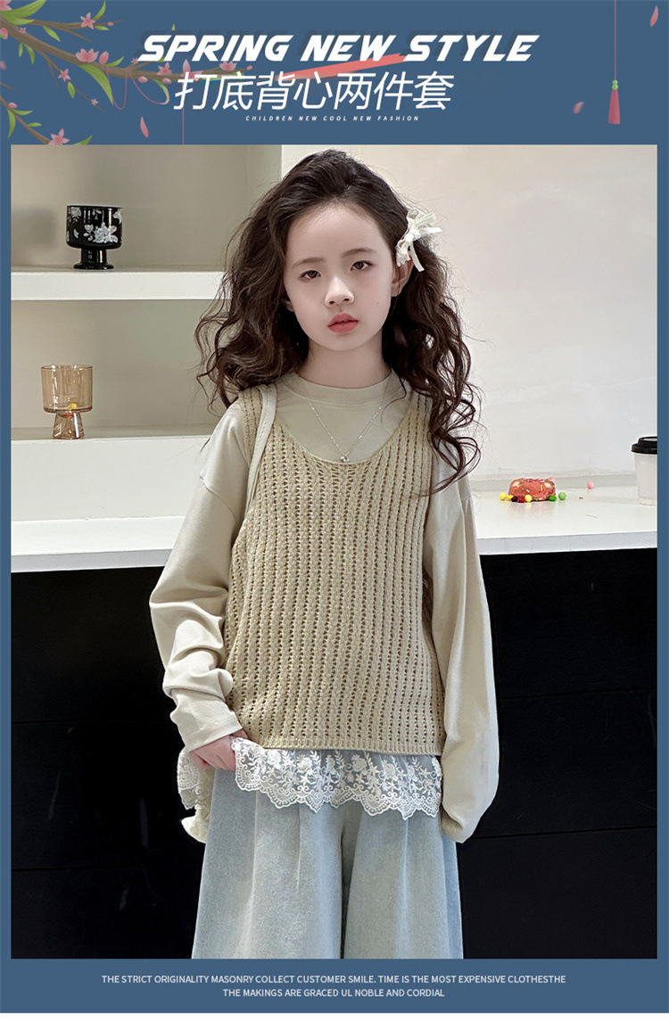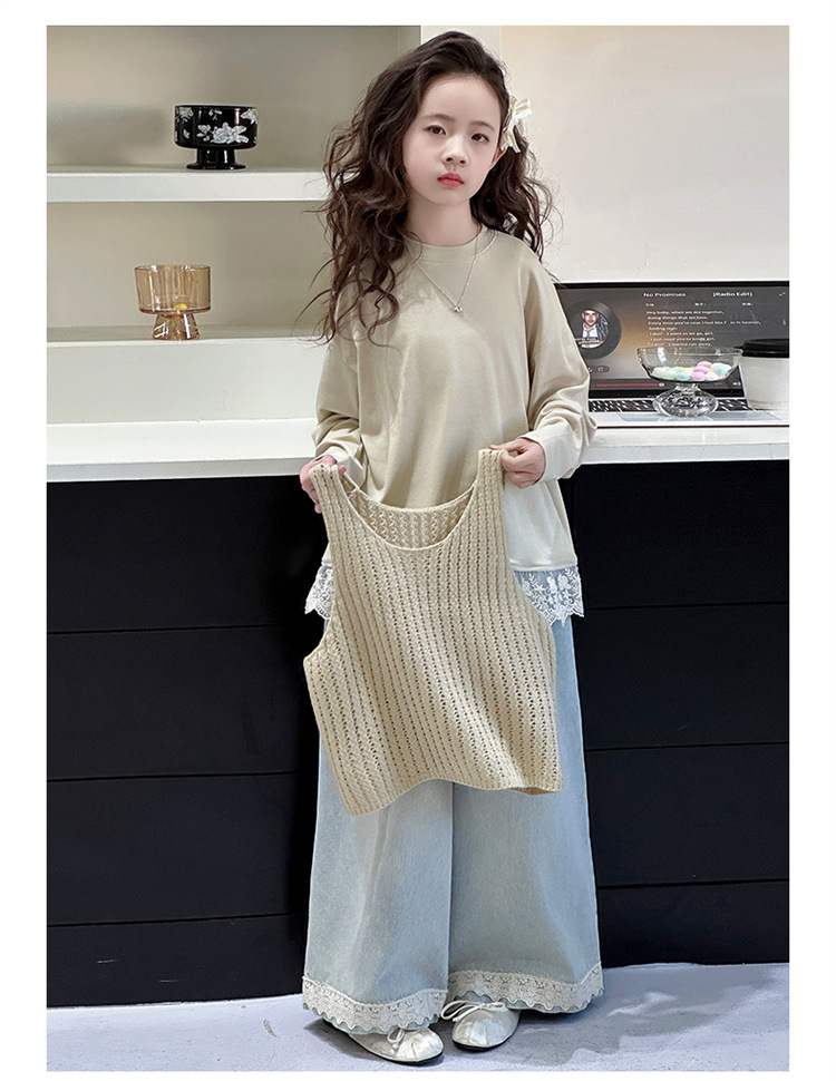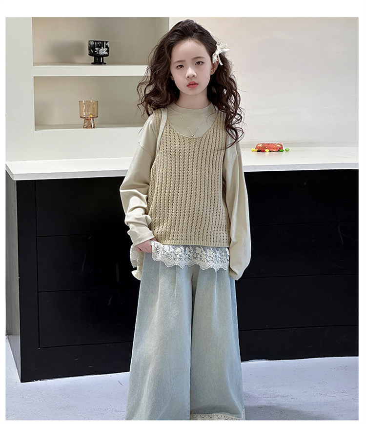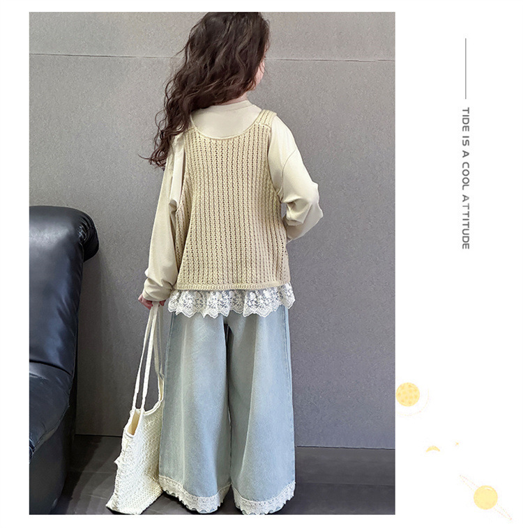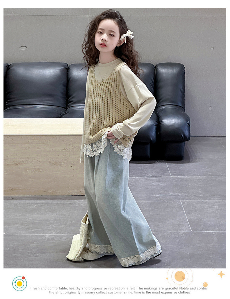 여자 봄 세트 2025 새로운 cuhk 어린이 서양식 레이스 바닥 셔츠 조끼 청바지 3 피스 세트스토어 가기