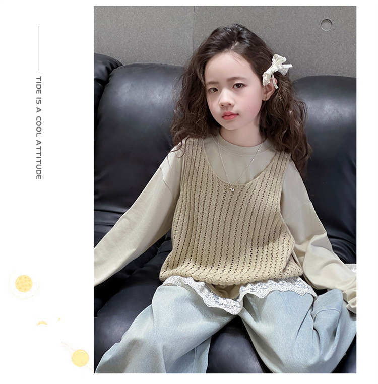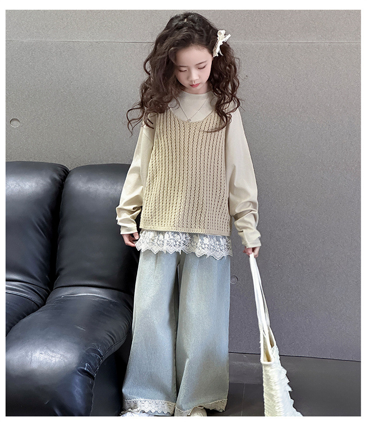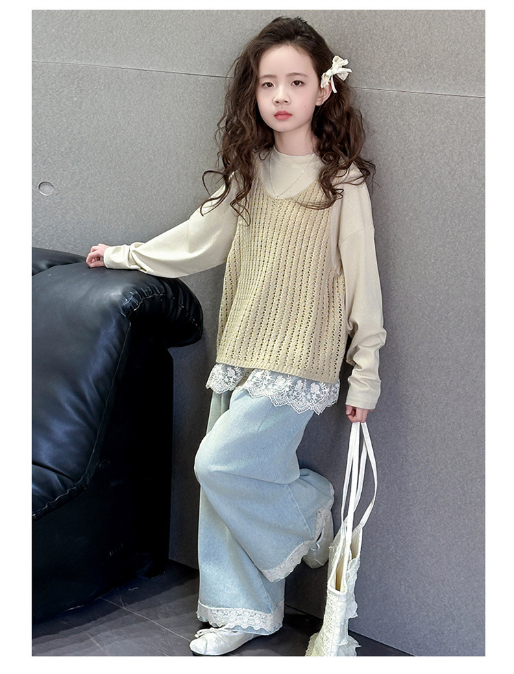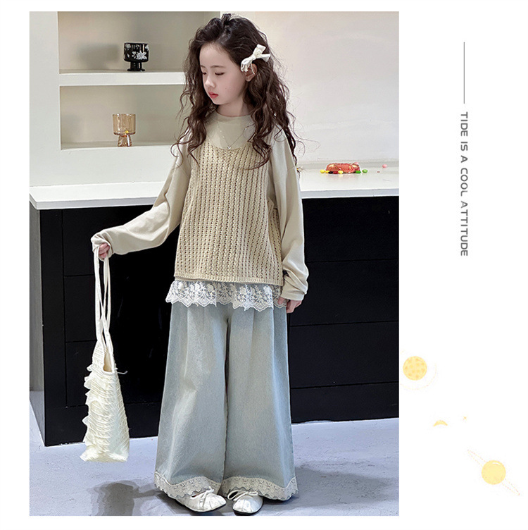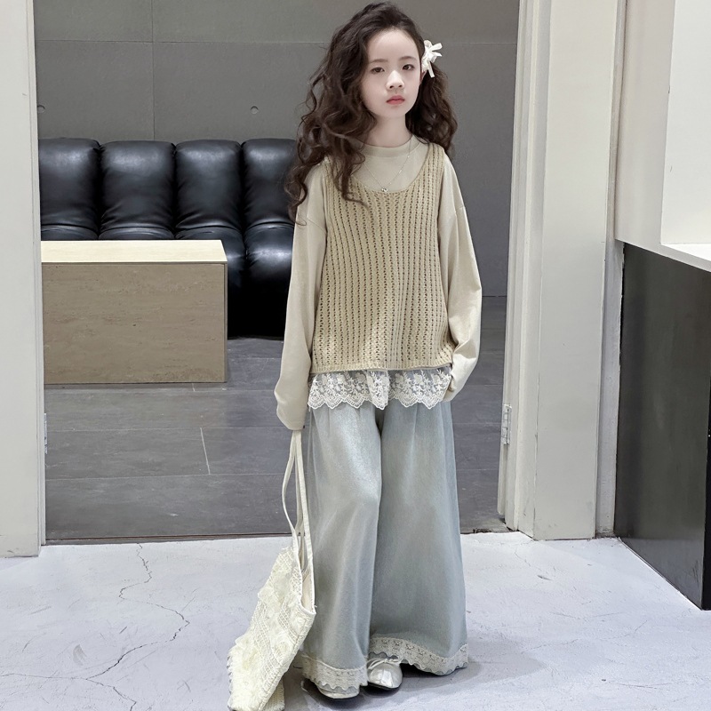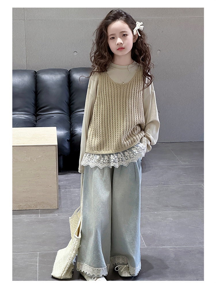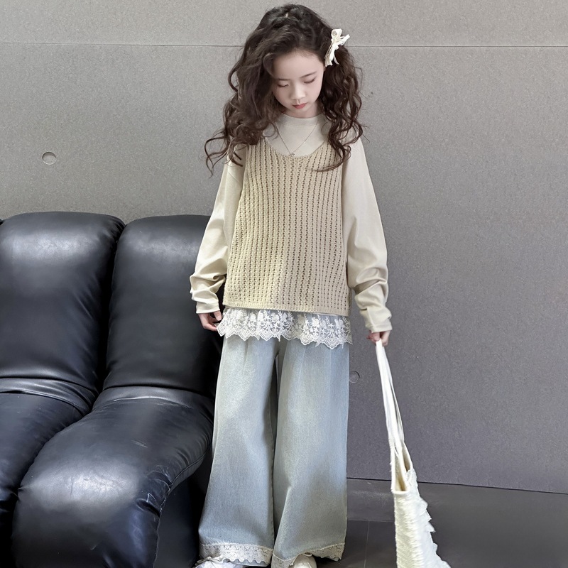 여자 봄 세트 2025 새로운 cuhk 어린이 서양식 레이스 바닥 셔츠 조끼 청바지 3 피스 세트