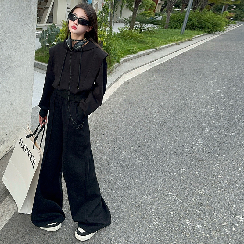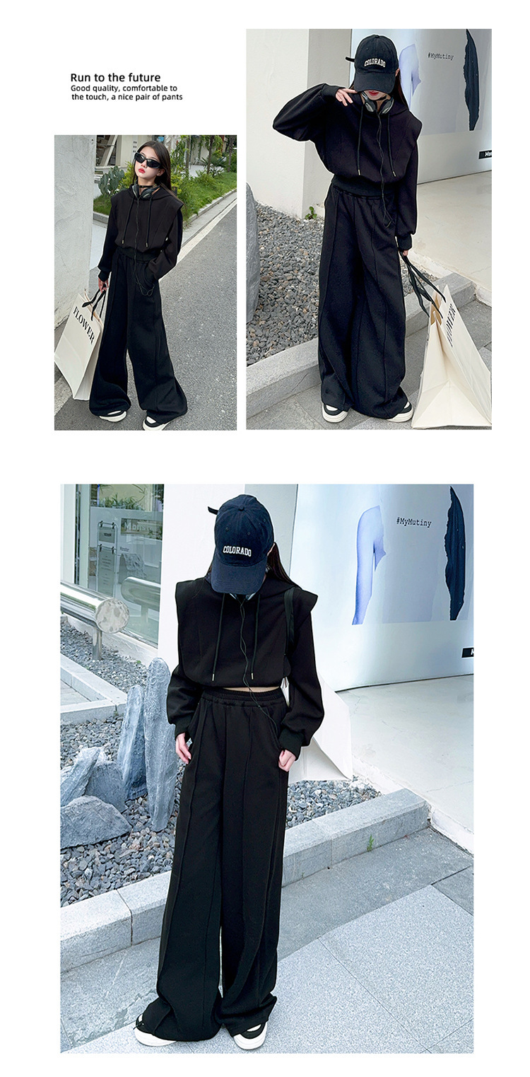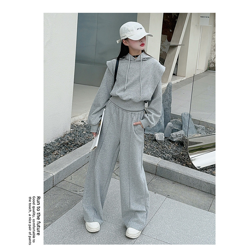 소녀 2024 패션 스포츠 세트 느슨한 슬리밍 짧은 후드 스웨트 재킷 높은 허리 넓은 다리 바지 세트