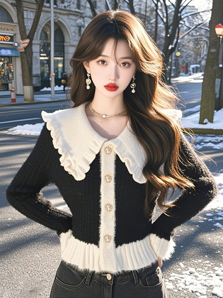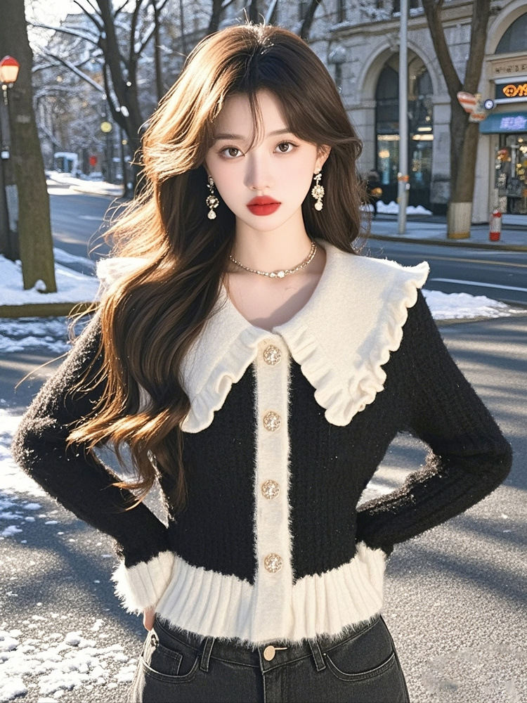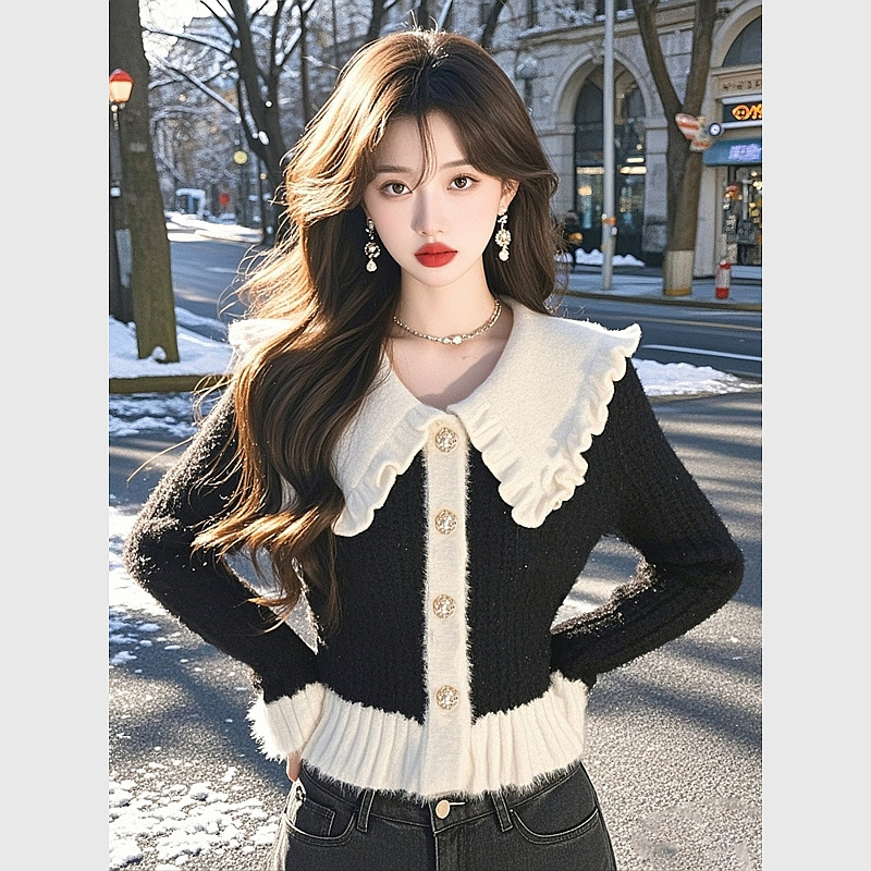 2025 겨울 프랑스 우아한 인형 칼라 높은 우아한 슈퍼 잘 생긴 모든 경기 슬리밍 연령 감소 흑백 명암 색 스웨터스토어 가기