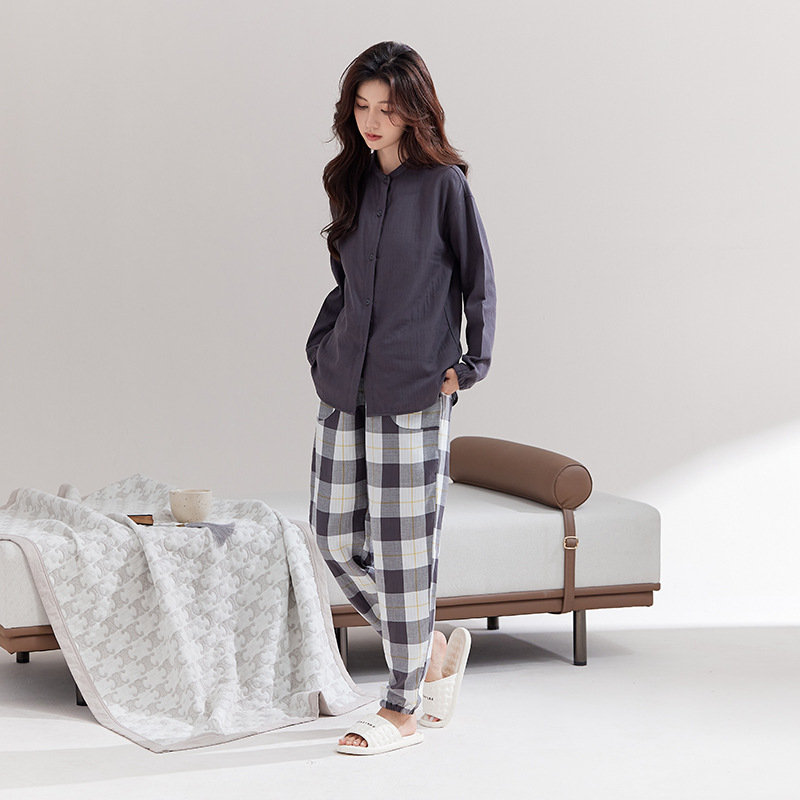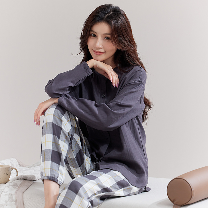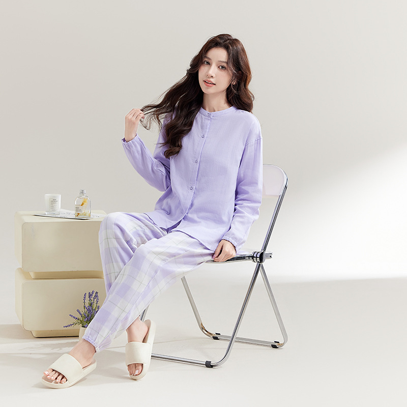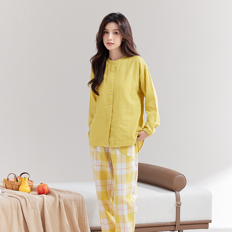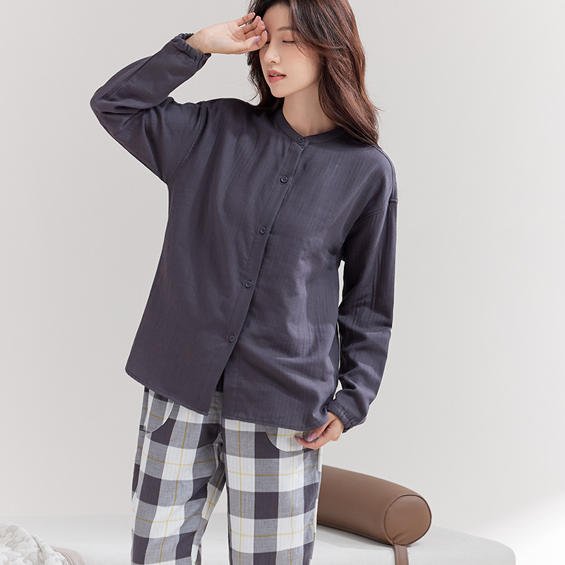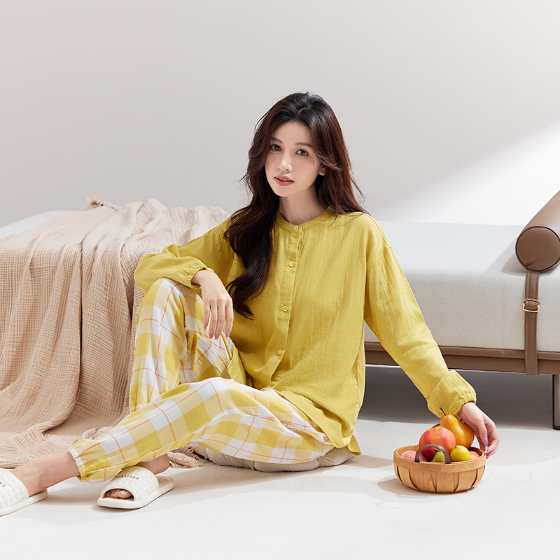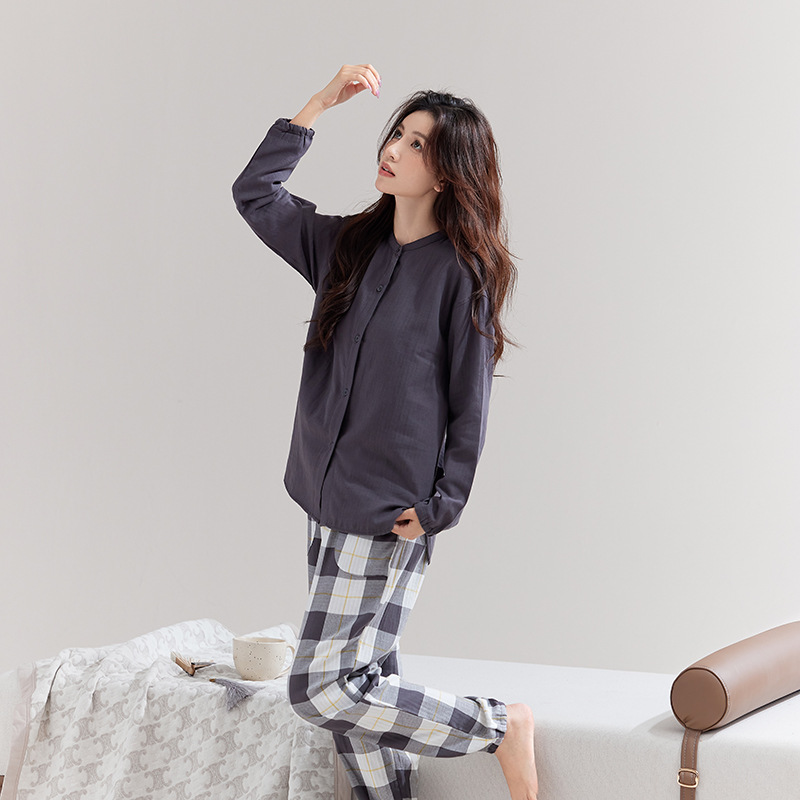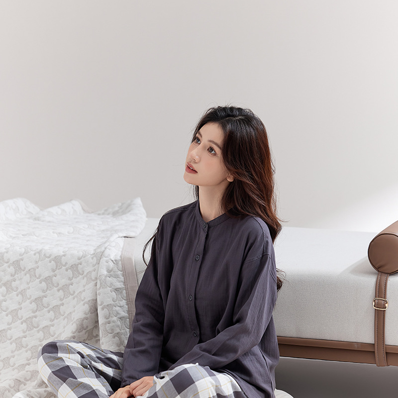 퓨어 코튼 뮤인 국립 패션 홈 의류 남성 봄 긴 소매 여성의 좋은 통기성 더블 레이어 원사 파자마 여성 세트스토어 가기