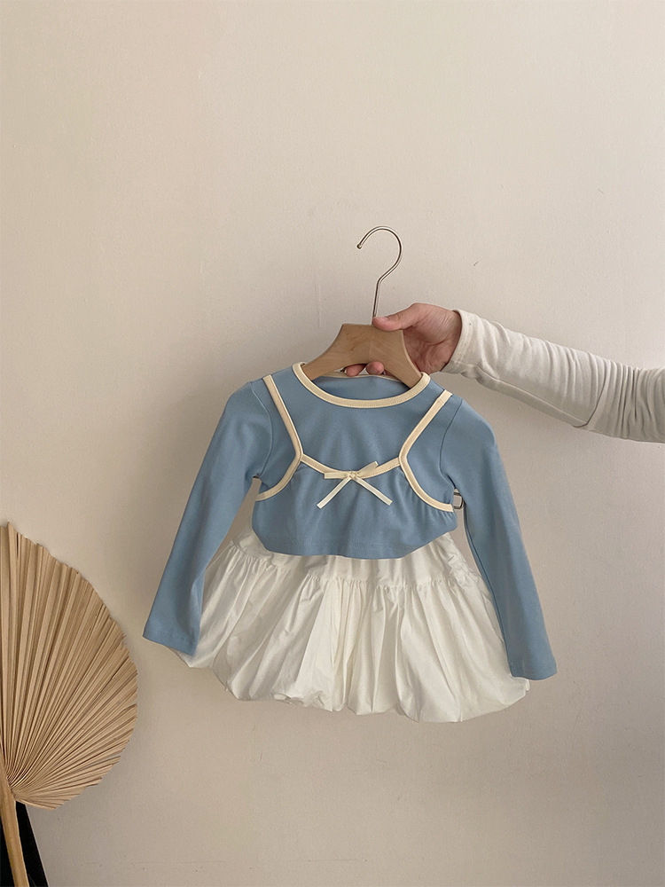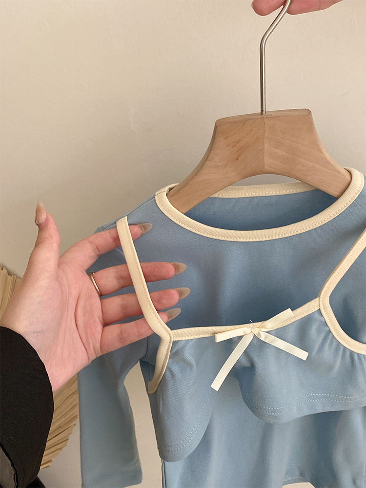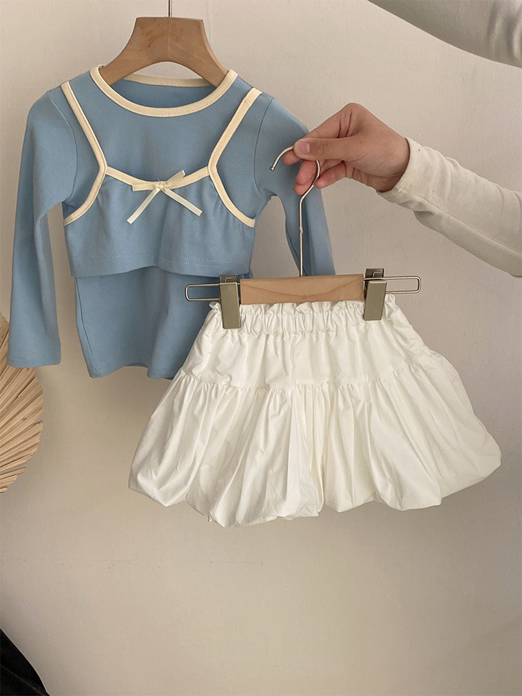 소녀 2025 새로운 스타일 어린이 캐주얼 활 가짜 투피스 탑 크루 넥베이스 셔츠 귀여운 폰툰 원피스스토어 가기