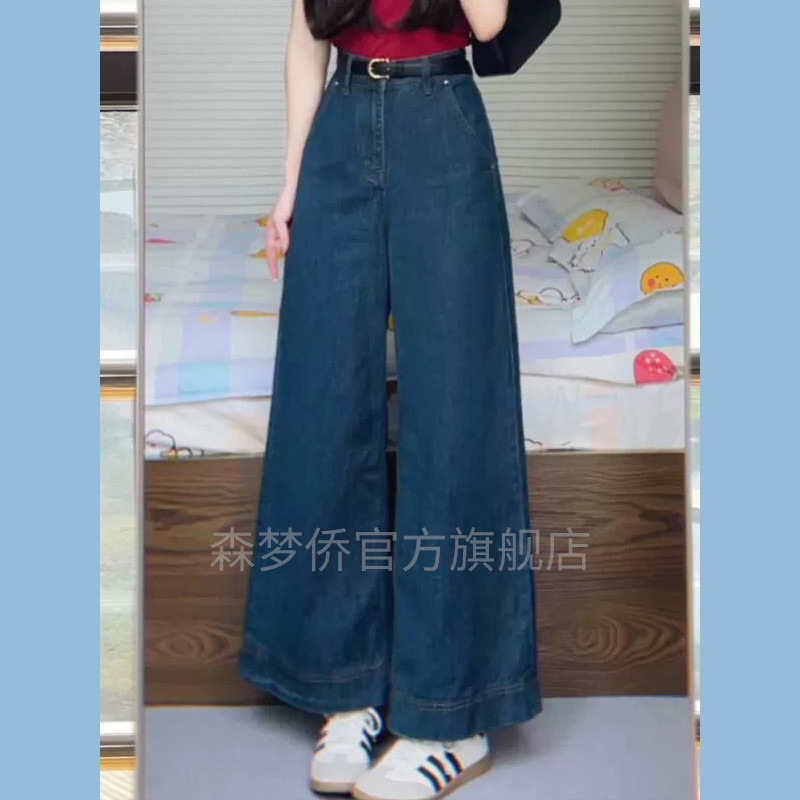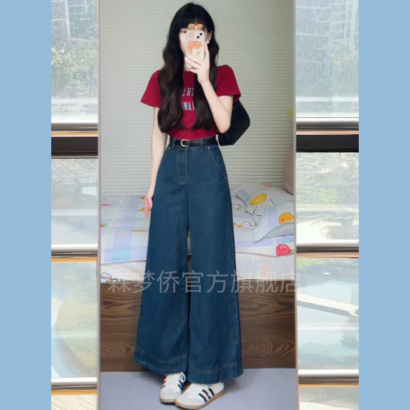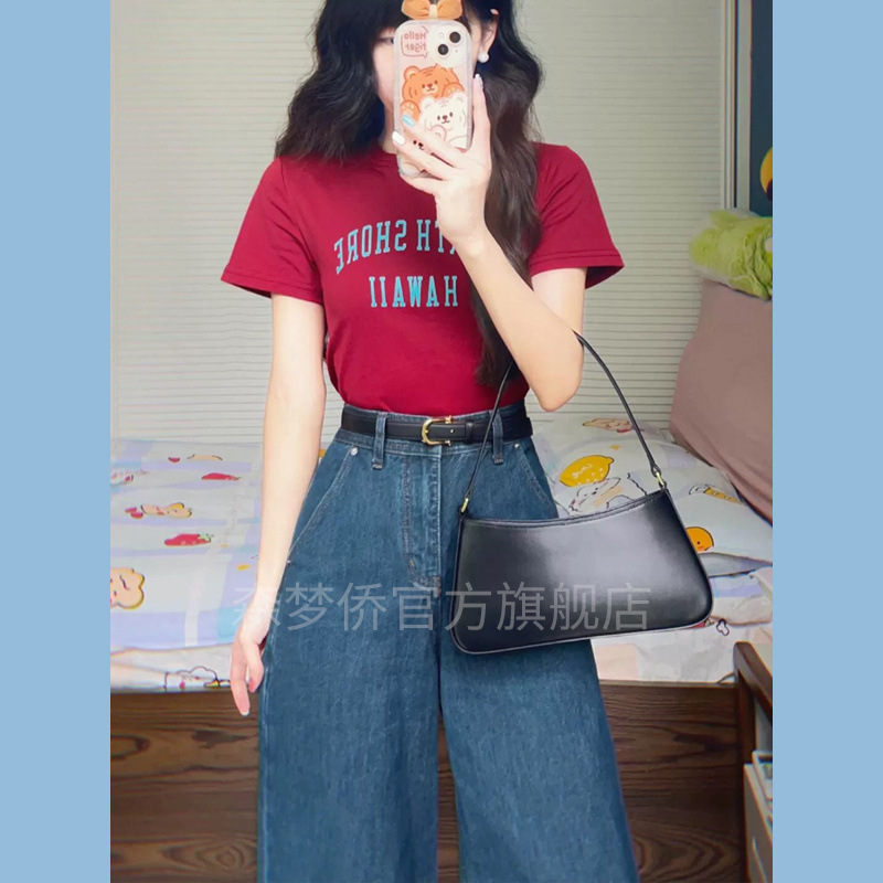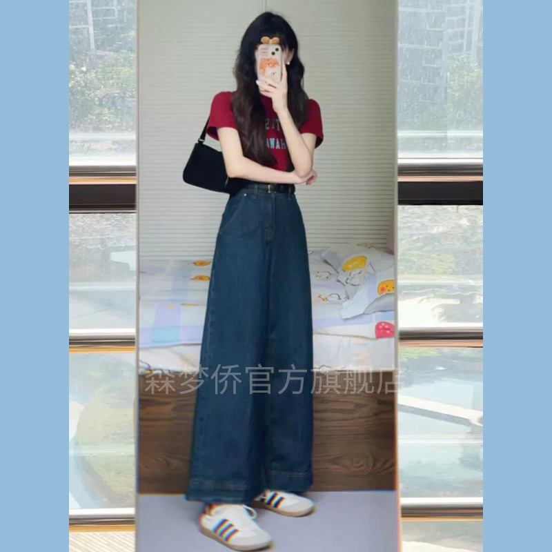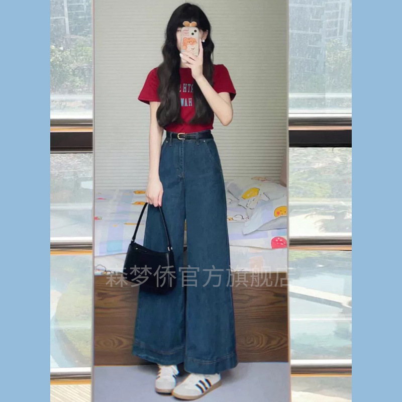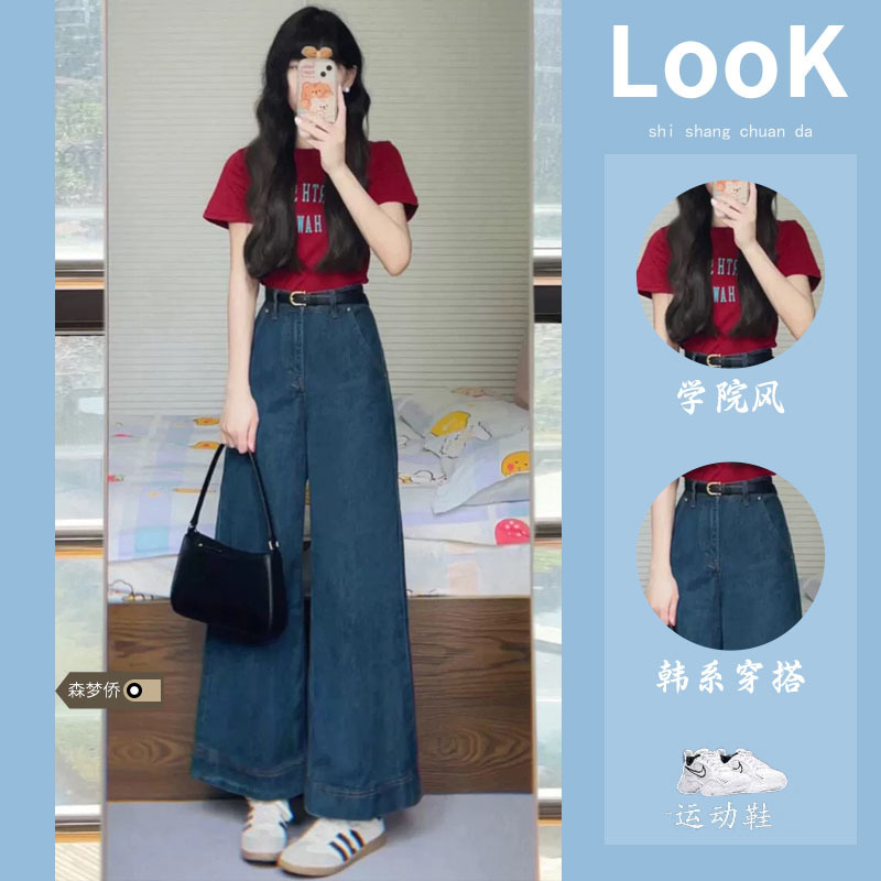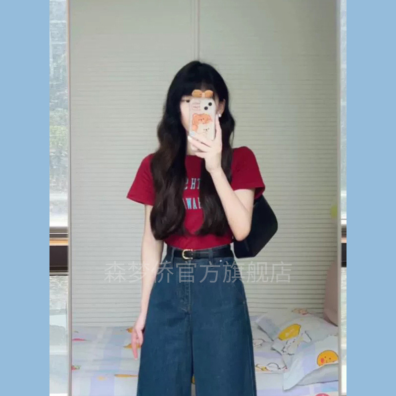 • [투피스세트] 버건디 숏티셔츠 + 데님 와이드팬츠