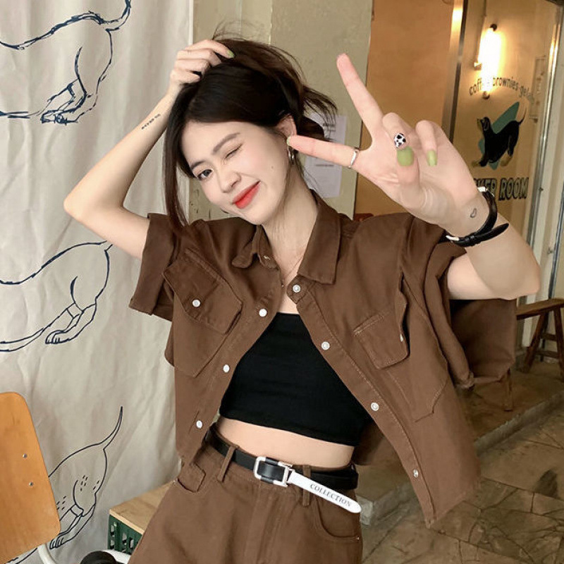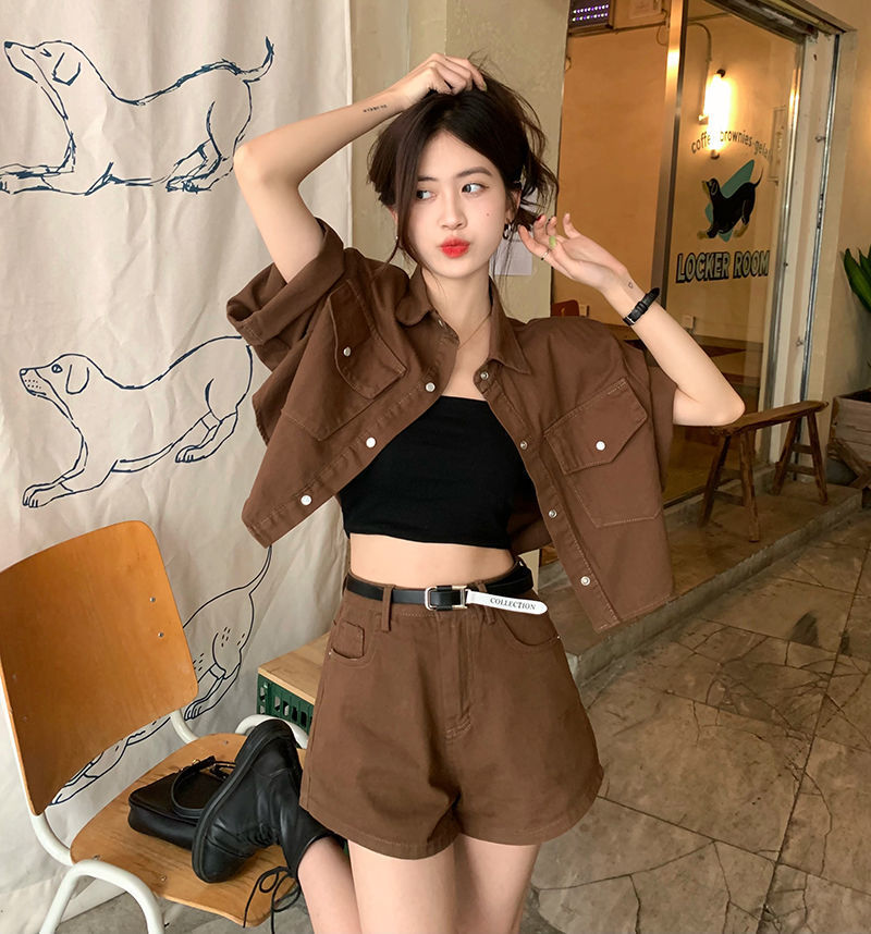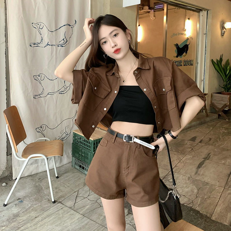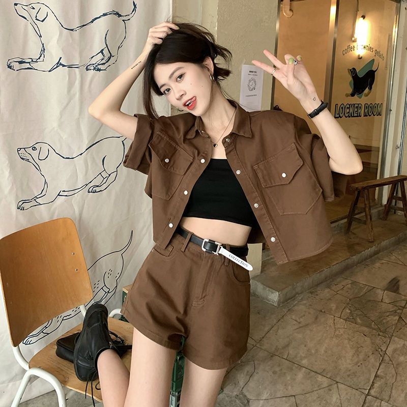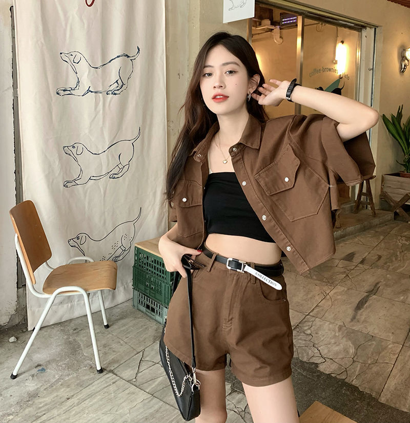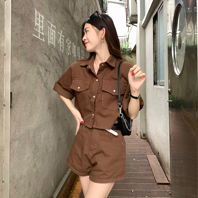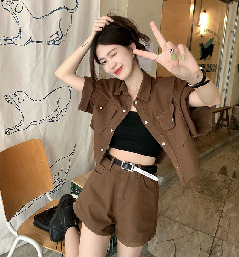 빈티지 홍콩 스타일 데님 패션 세트 여성 여름 2025 새로운 도착 반바지 하이 엔드 투피스 세트