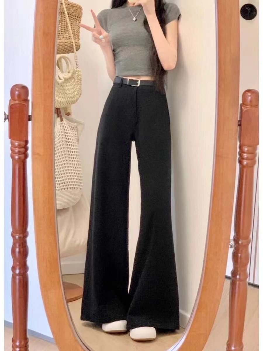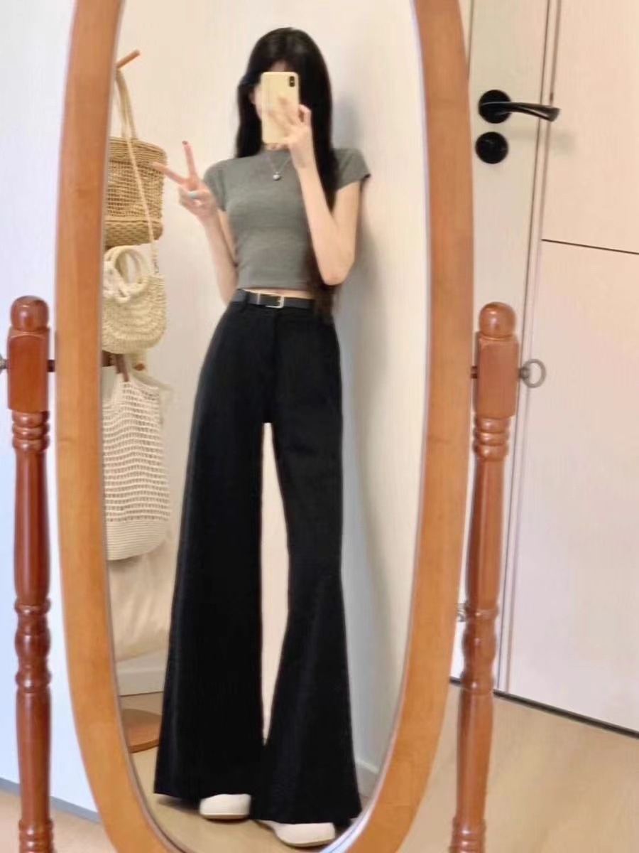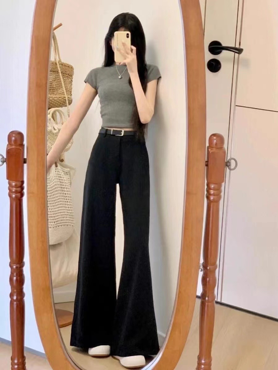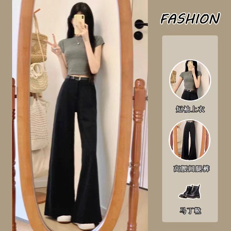세트 여자 2025 년 여름 새로운 순수한 욕망 뜨거운 소녀 슬림 핏 반팔 티셔츠 탑 하이 허리 와이드 레그 바지 투피스 세트