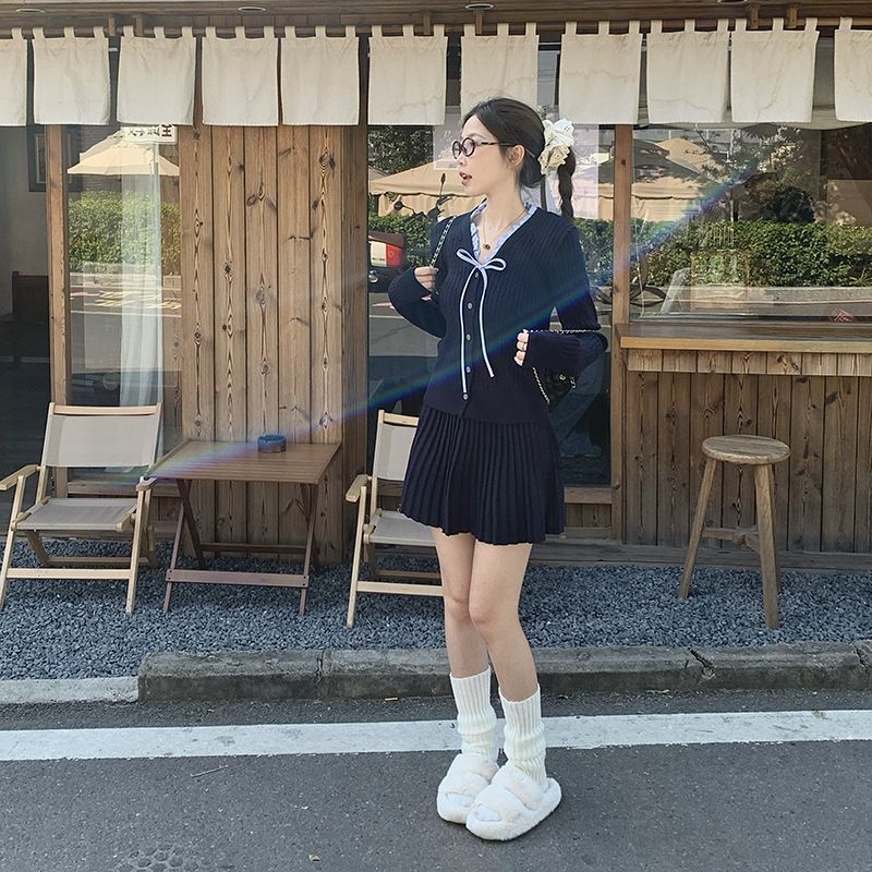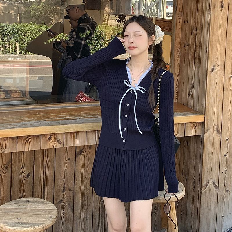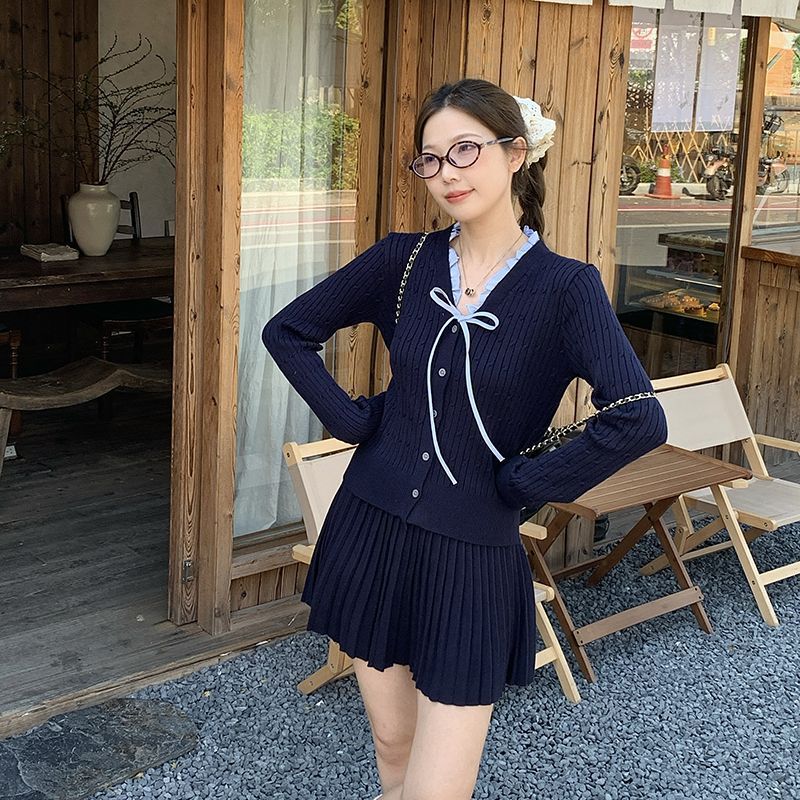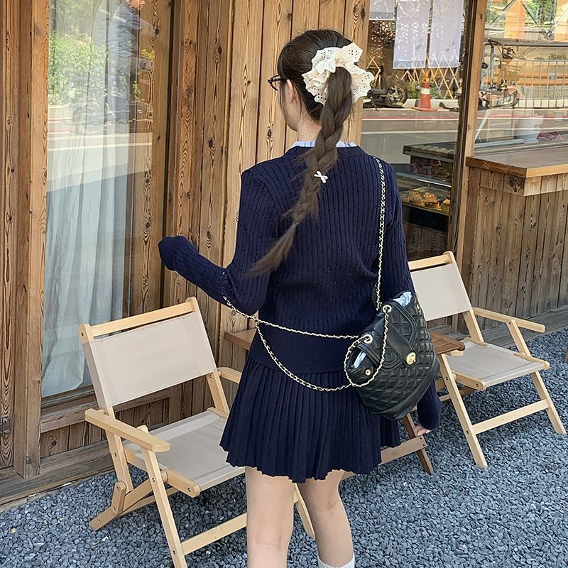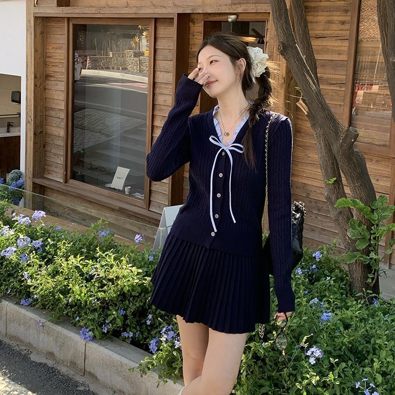 한국 스타일 대학 스타일 네이비 V 넥 긴팔 니트웨어 여성 이른 봄 우아한 슬림핏 내베이스 셔츠 카디건