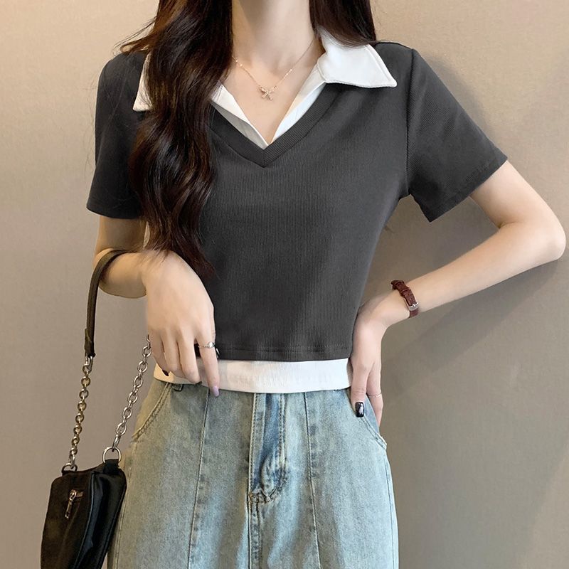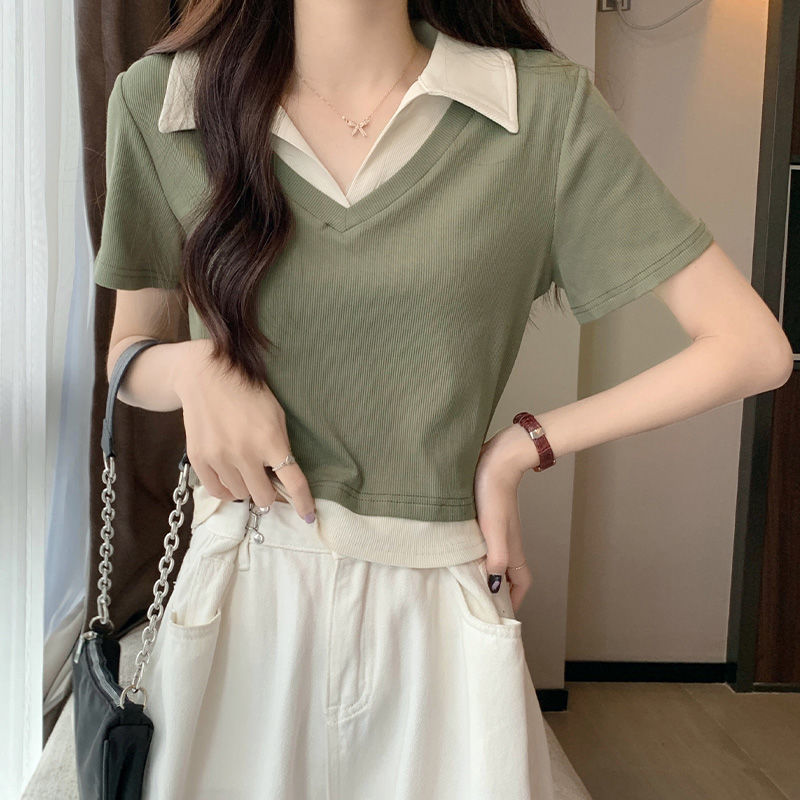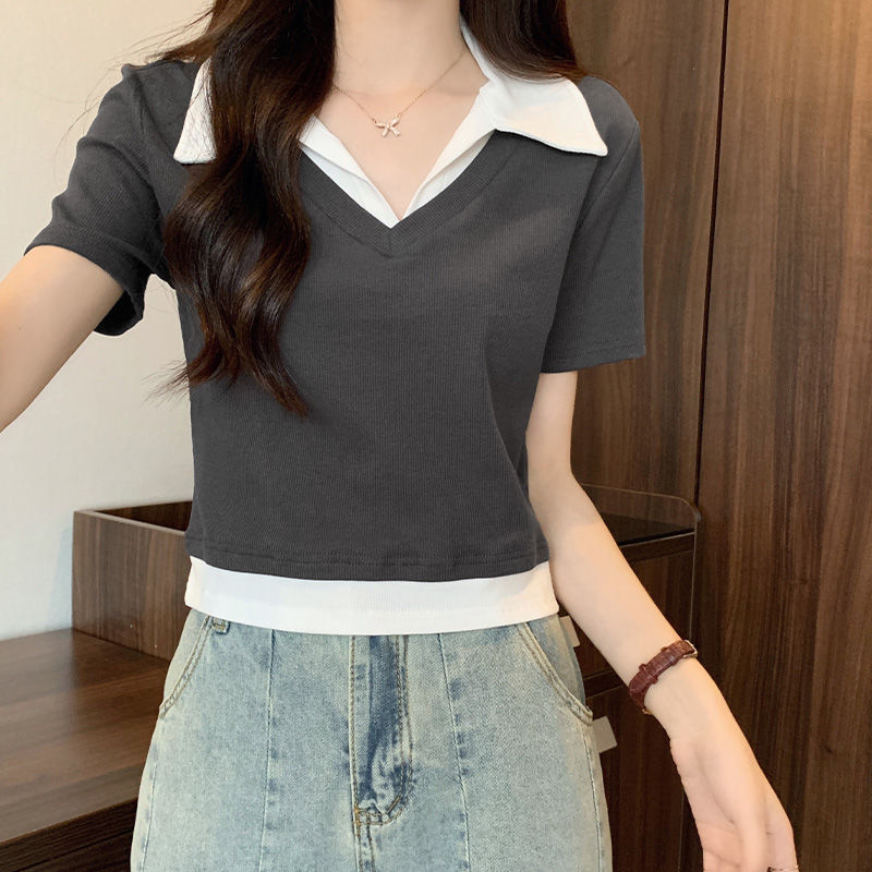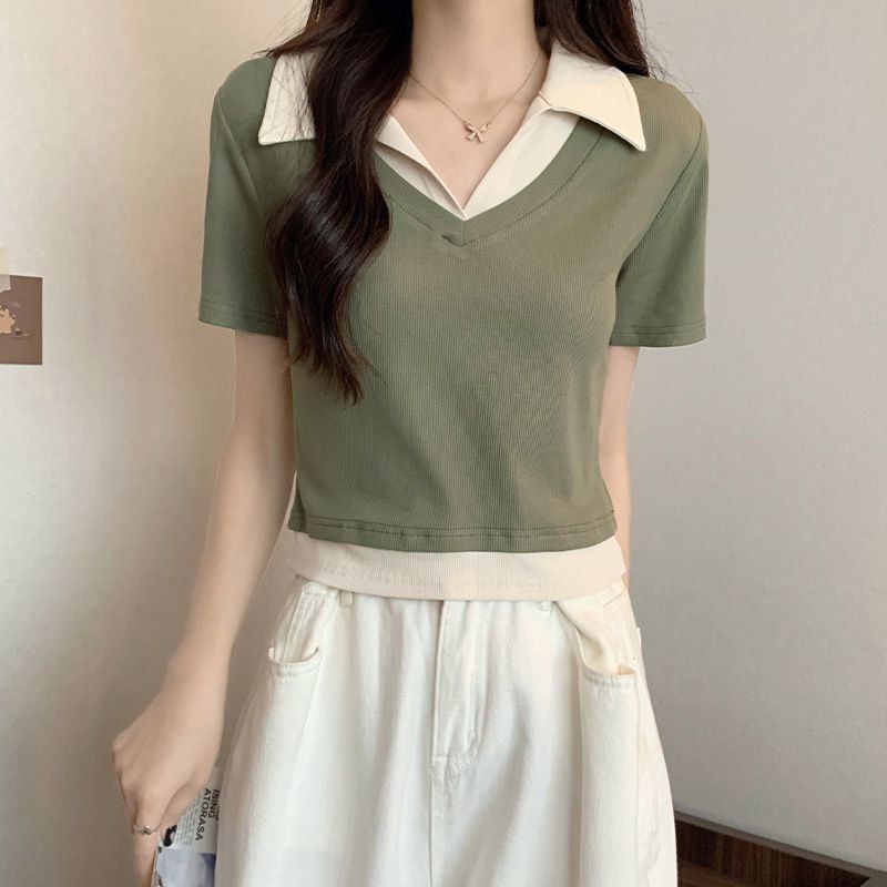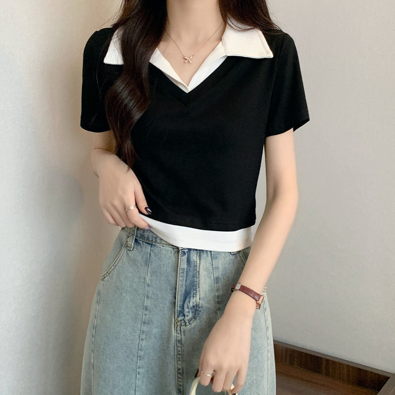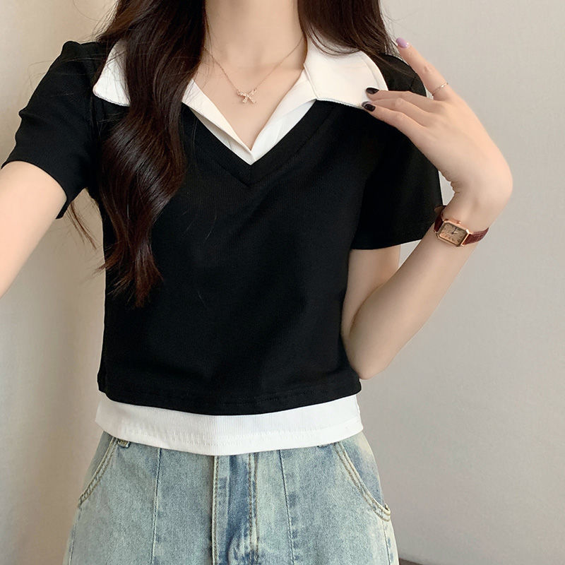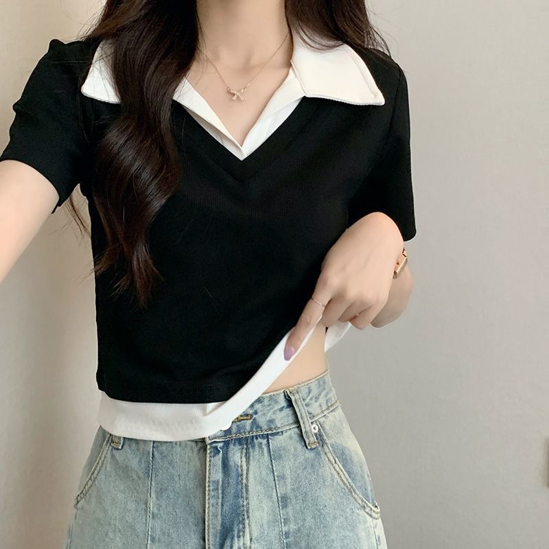 명암 칼라 어깨 반팔 셔츠 여자 2025 년 여름 슬리밍 서양식 가짜 투피스 세련된 쇼트 셔츠 탑