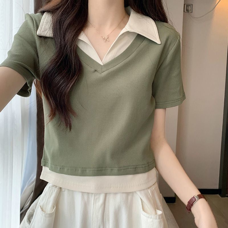 명암 칼라 어깨 반팔 셔츠 여자 2025 년 여름 슬리밍 서양식 가짜 투피스 세련된 쇼트 셔츠 탑스토어 가기