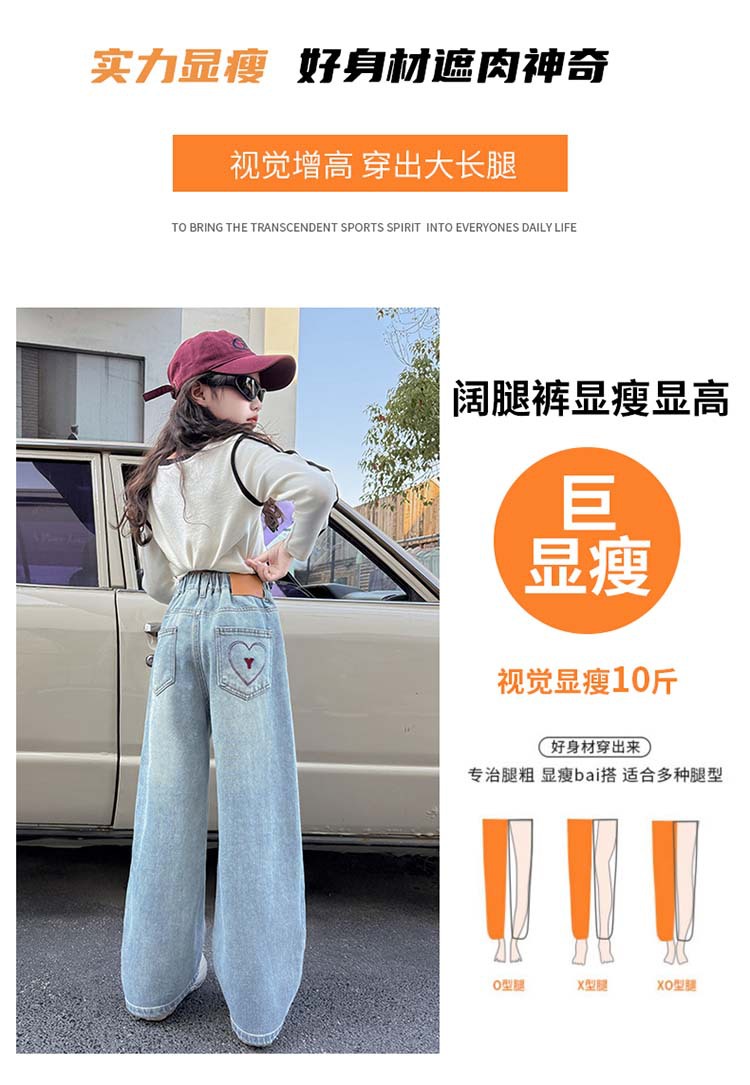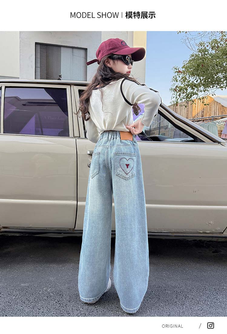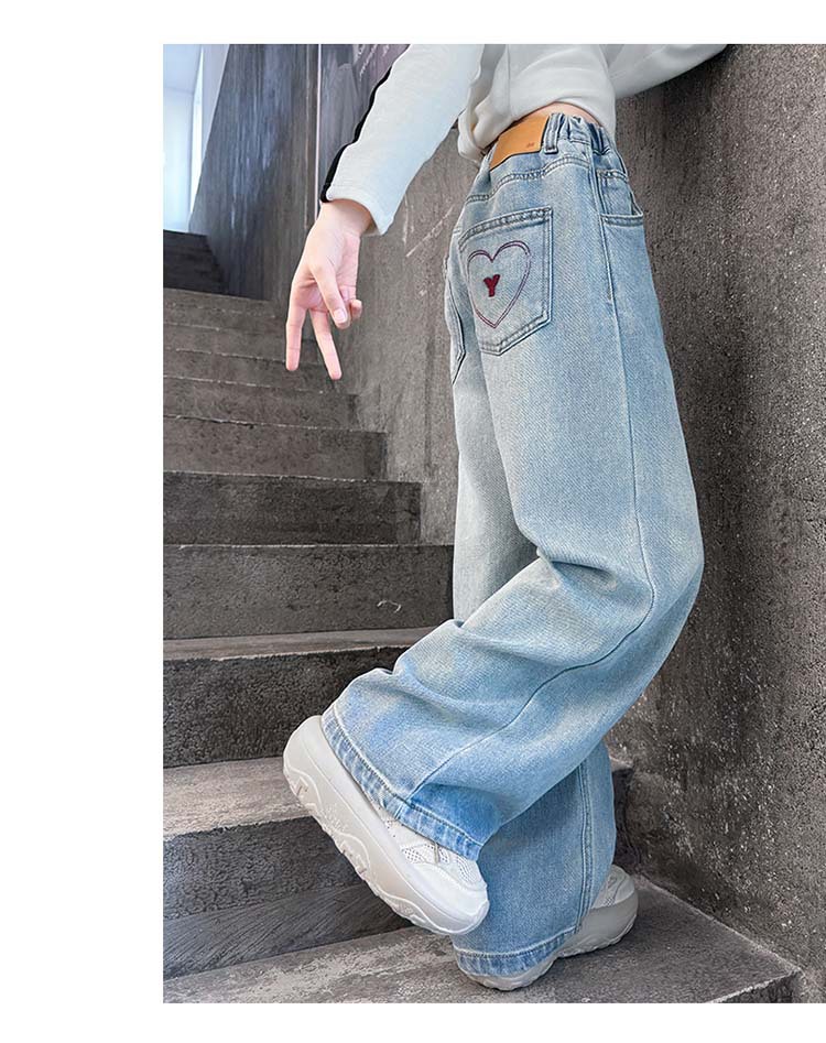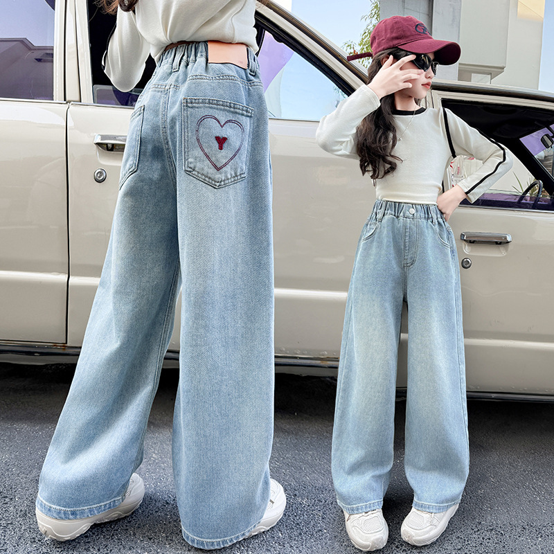 대외 무역 어린이 바지 소녀 백 가방 수 놓은 넓은 다리 바지 한국 버전 대형 어린이 느슨한 캐주얼 청바지 긴 대외 무역 도매스토어 가기