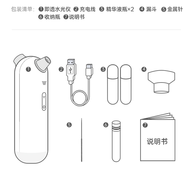 充电线*1 精华液瓶*2 金属针*1 收纳瓶*1 说明书*1