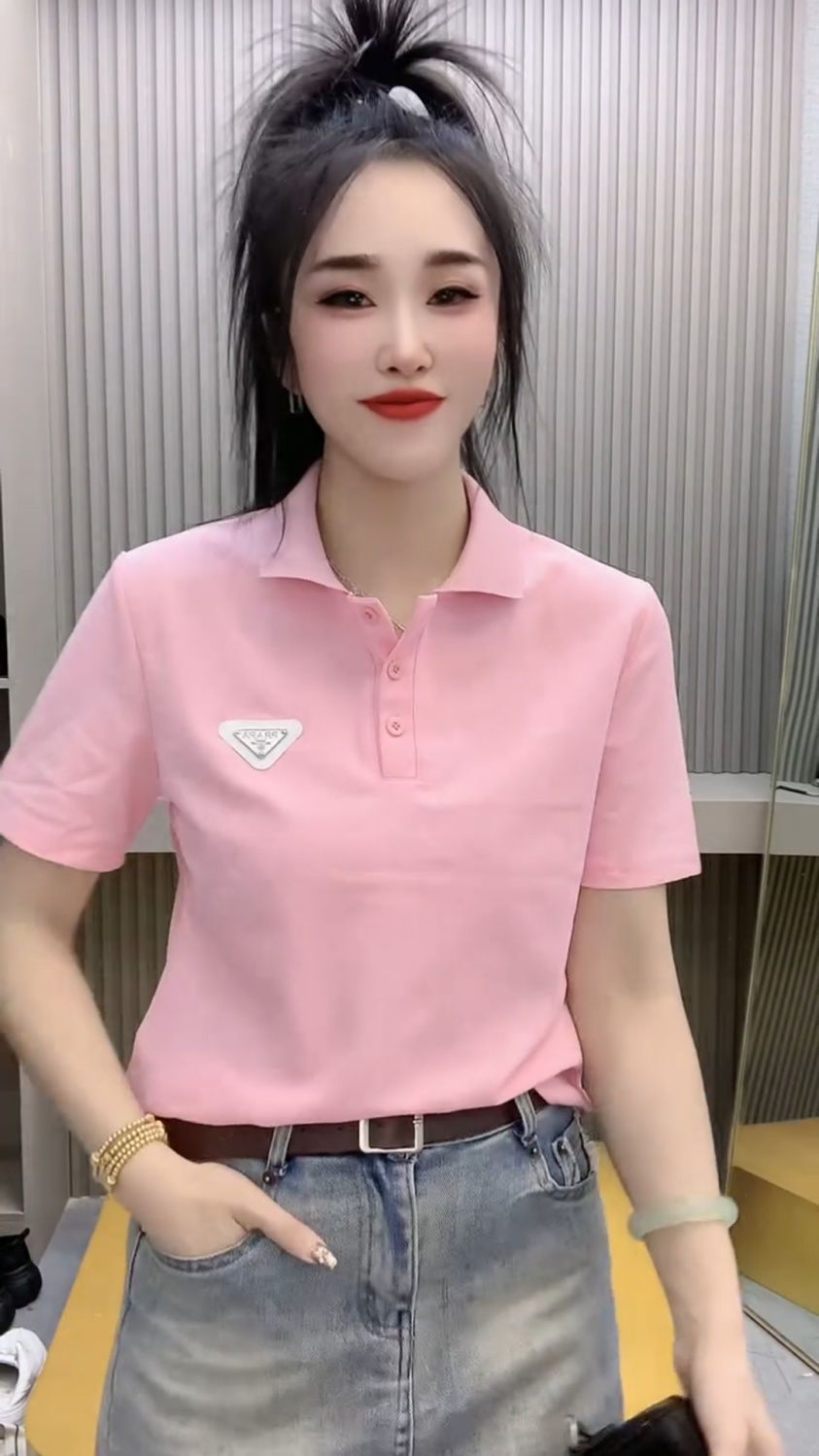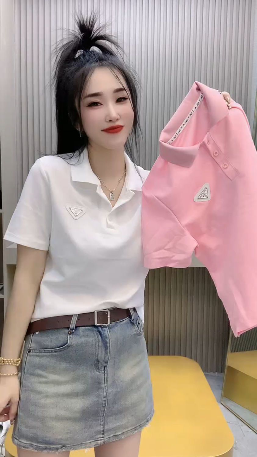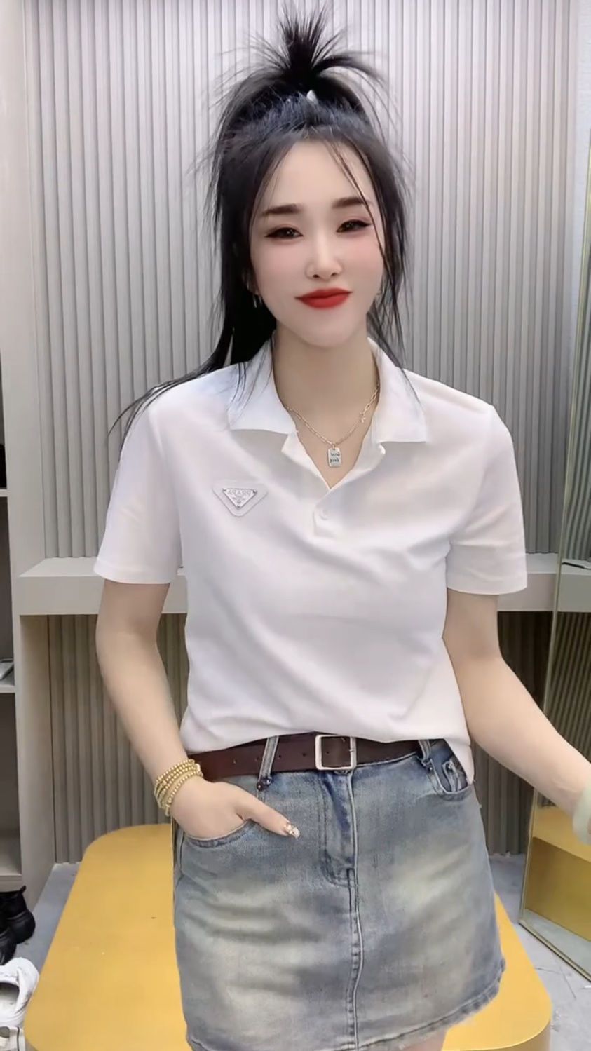 유럽 상품 여름 새로운 삼각형 라벨 반팔 셔츠 여성용 슬림 핏 슬리밍 서양식 올 매치 칼라 작은 셔츠 트렌디 탑
