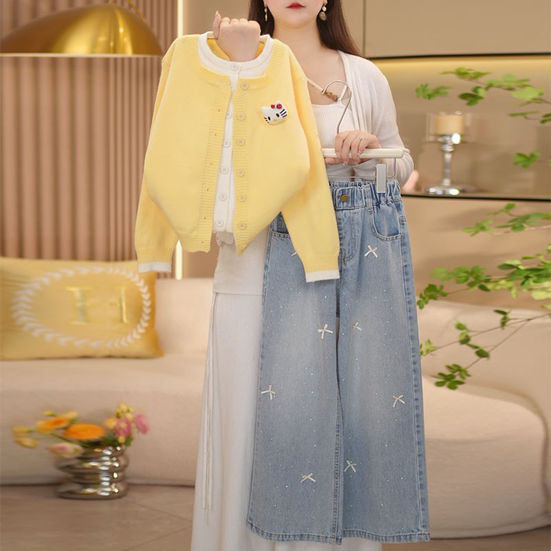 여자 2025 봄 새로운 패션 가짜 투피스 카디건 스웨터 탑 밝은 다이아몬드 청바지 세트 스웨터 가을