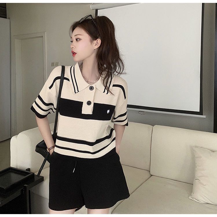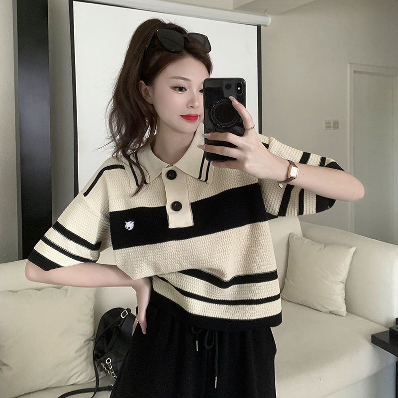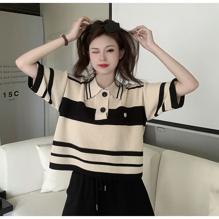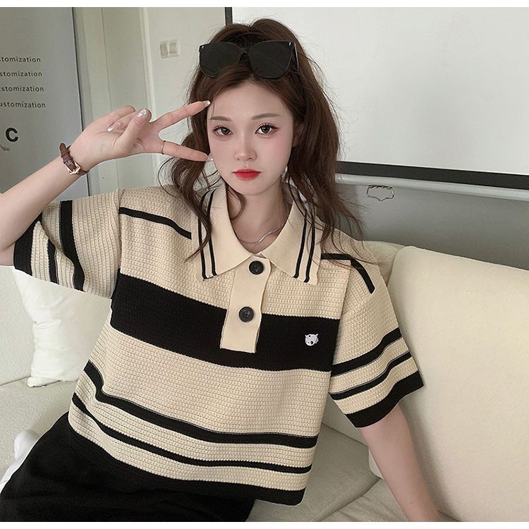 2025 새로운 스타일 레트로 스트라이프 니트 셔츠 셔츠 여성용 짧은 소매 여름 짧은 캐주얼 탑 트렌디스토어 가기