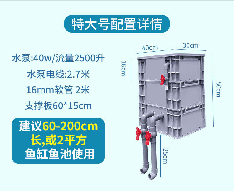 • 초대형 3겹 + 면 + 박테리아 컬럼 + 3.5kg 필터 소재 + 워터 펌프