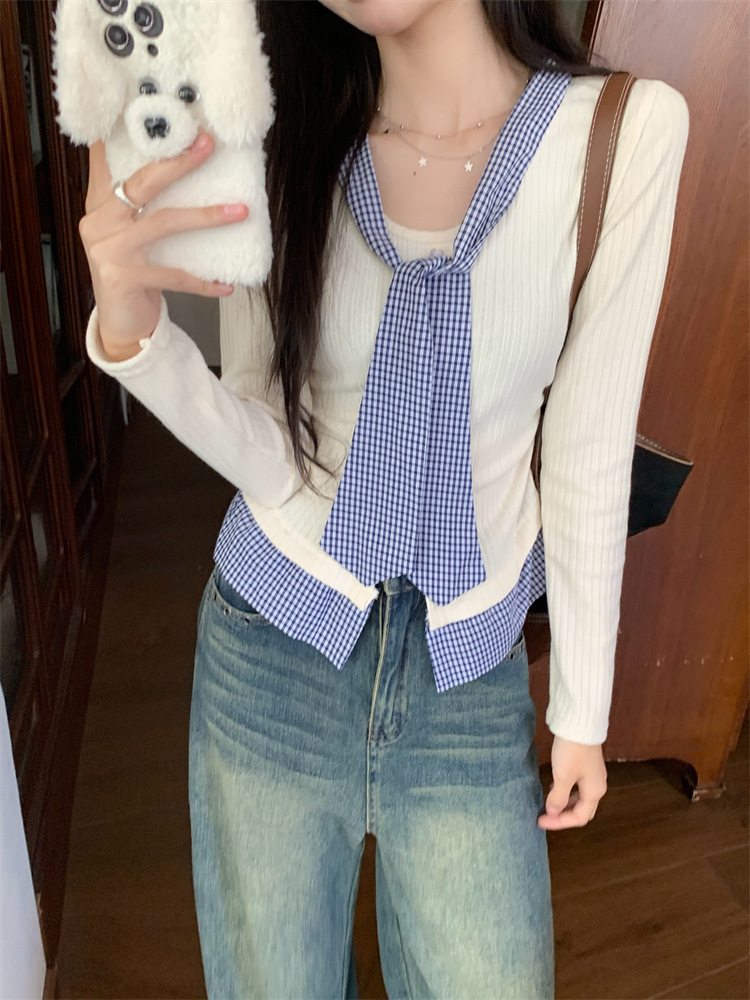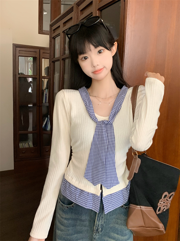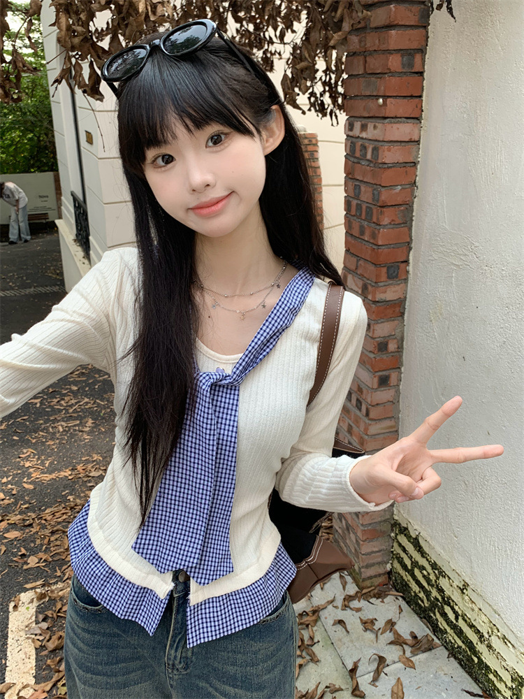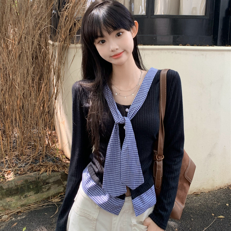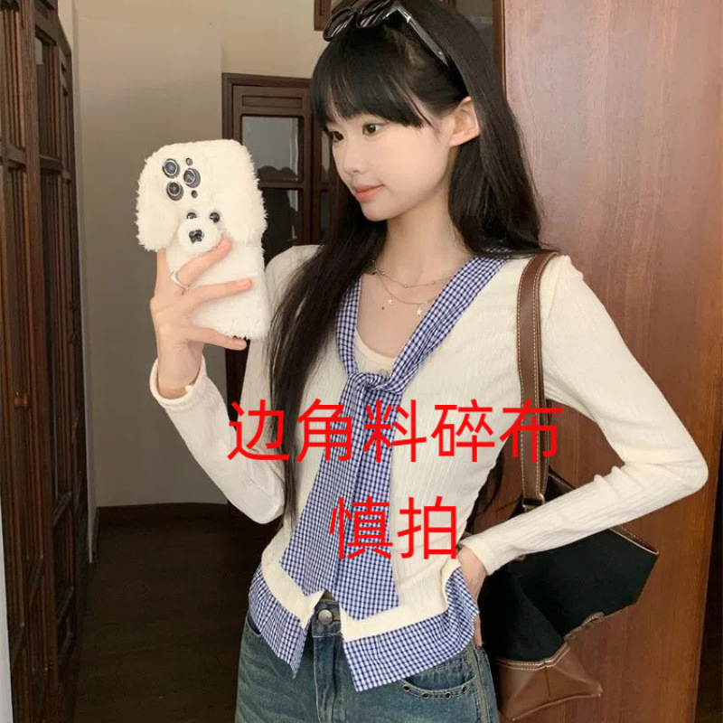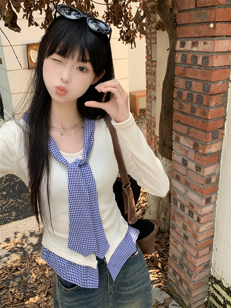 대학 스타일 명암 컬러 격자 무늬 바느질 가짜 투피스 니트웨어 여성 가을 겨울 한국 스타일 세련된 톱 디자인 센스 작은 셔츠