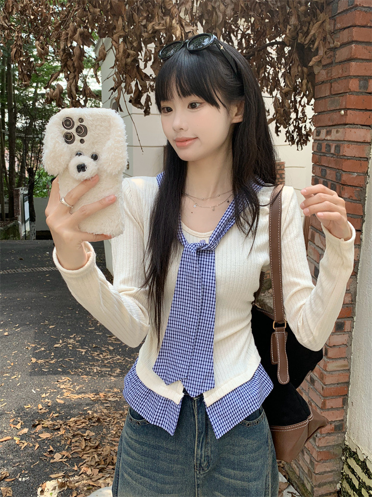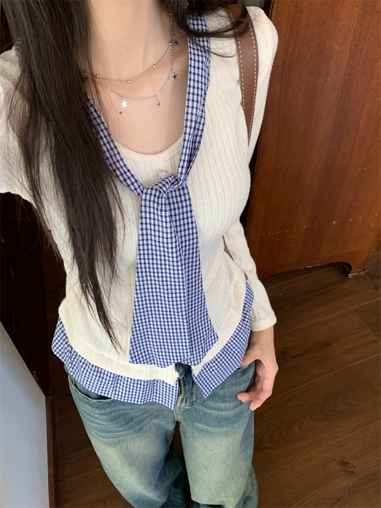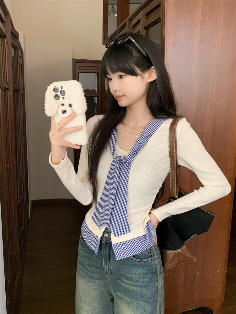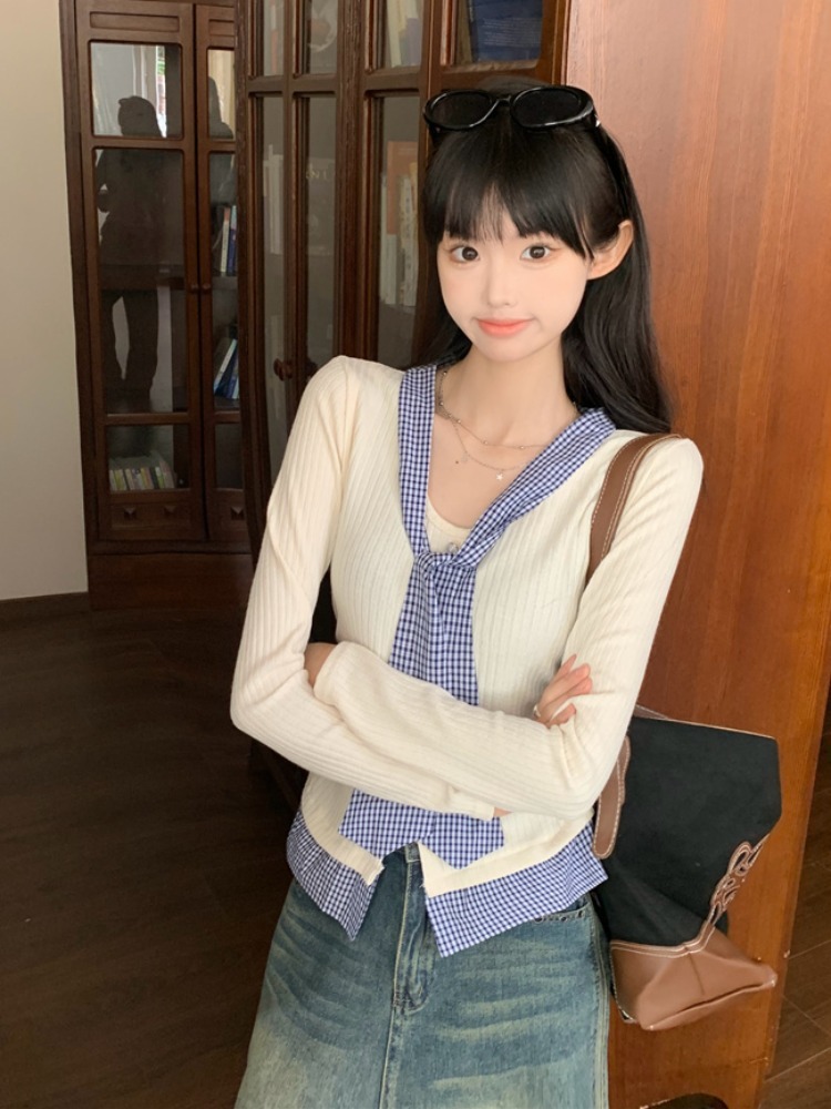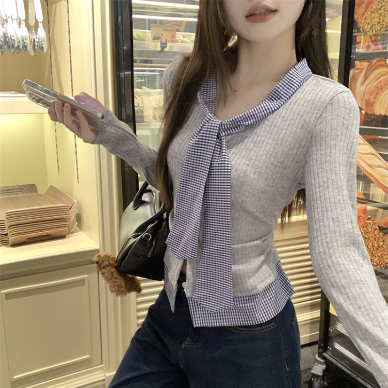대학 스타일 명암 컬러 격자 무늬 바느질 가짜 투피스 니트웨어 여성 가을 겨울 한국 스타일 세련된 톱 디자인 센스 작은 셔츠