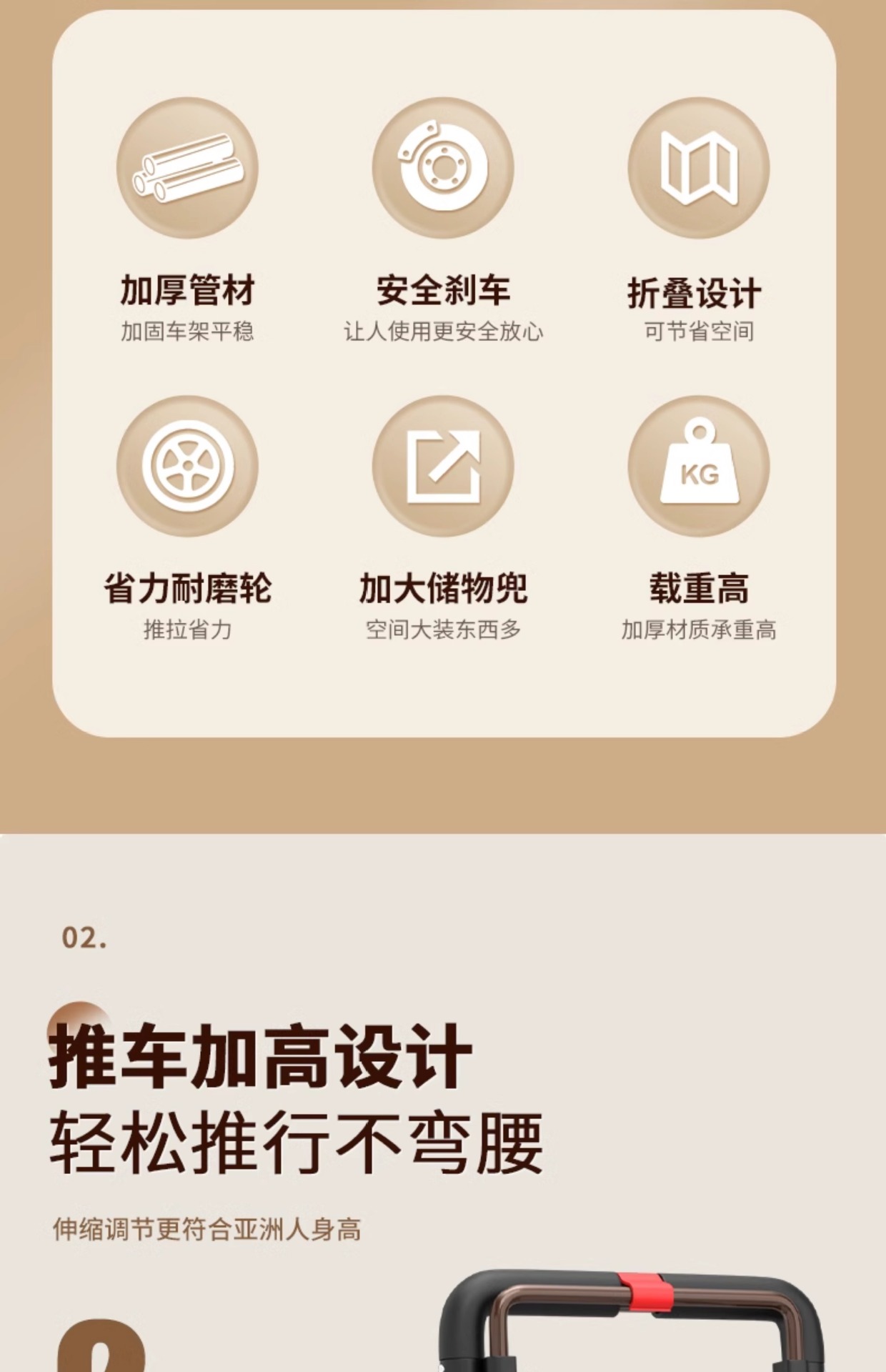 • 새로운 강화 - 대형 등받이 이중 휠 핸드 브레이크 골드
