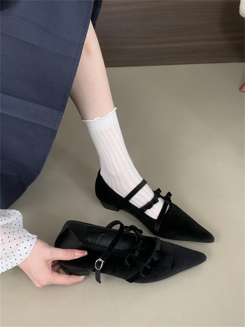 프랑스 스타일 우아한 벨벳 두꺼운 힐 메리 제인 신발 여성 싱글 레이어 신발 2025 여름 새로운 얕은 입 뾰족한 활 펌프