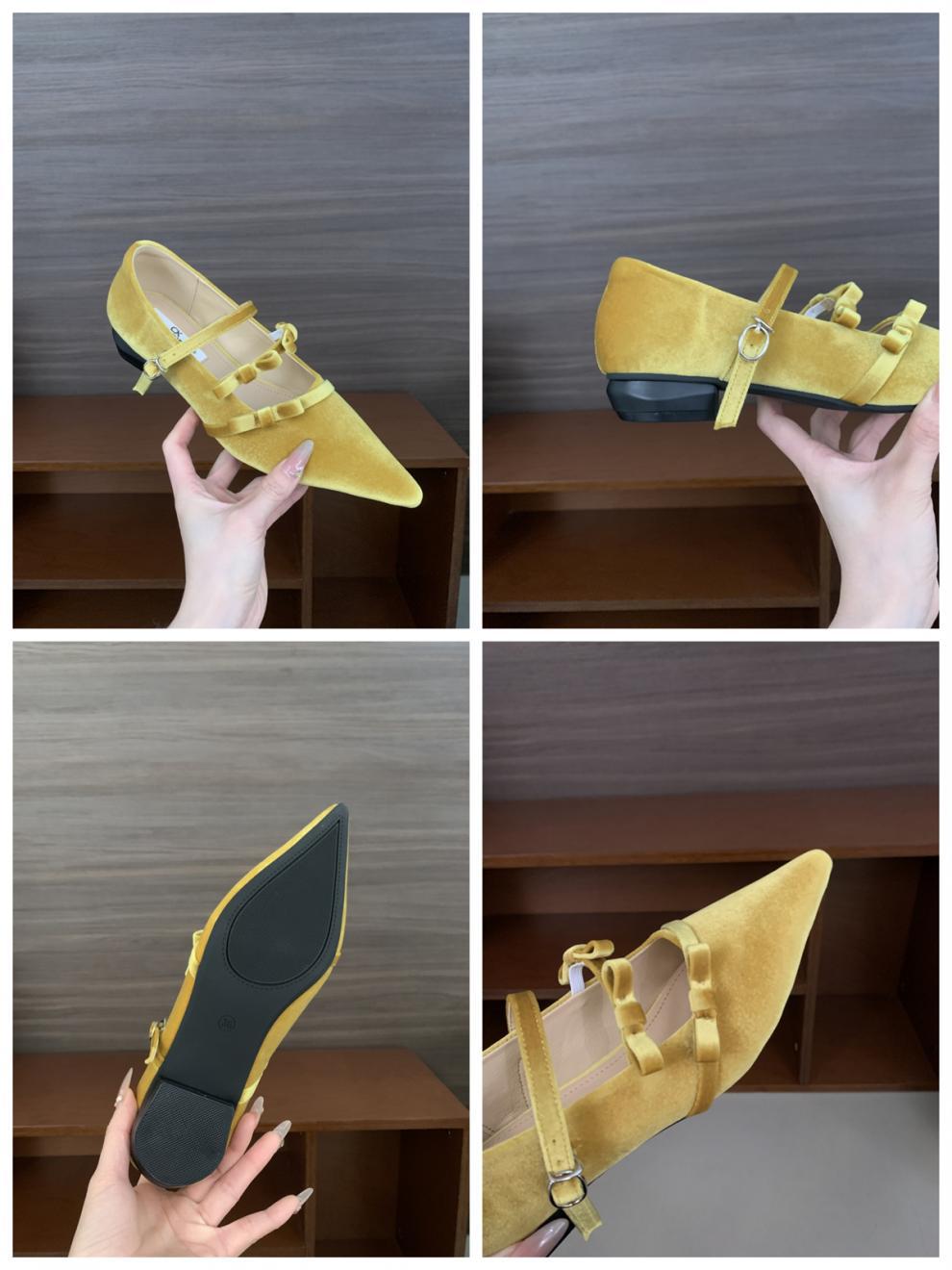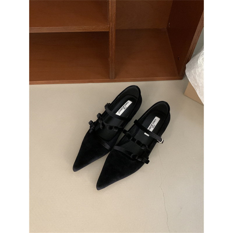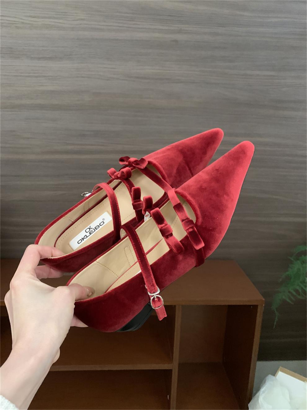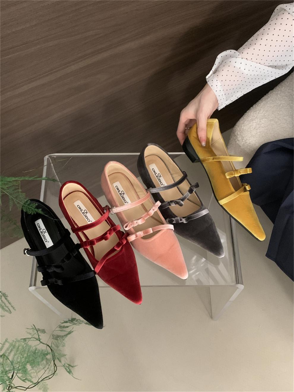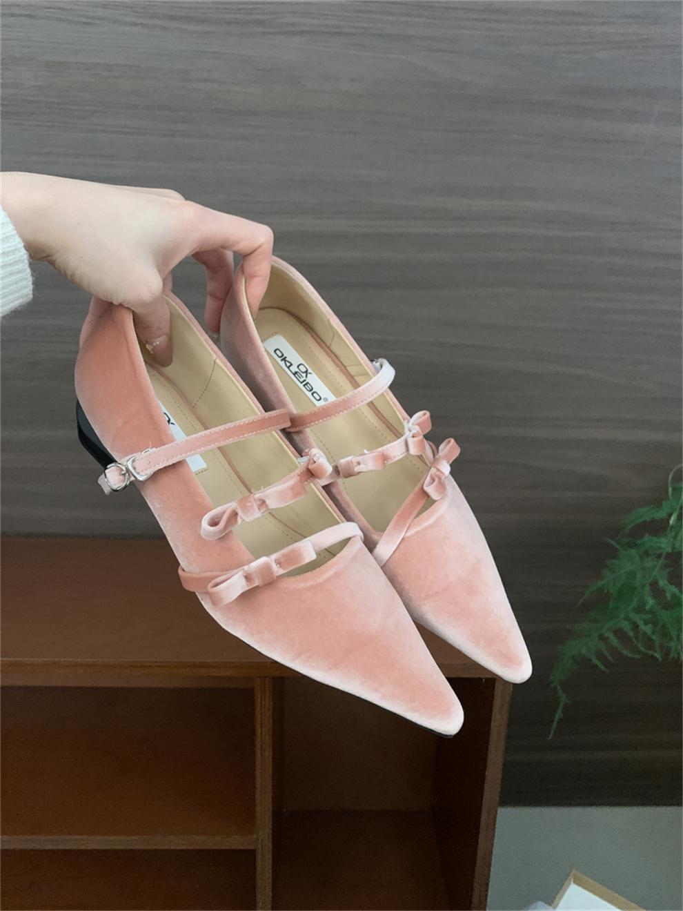 프랑스 스타일 우아한 벨벳 두꺼운 힐 메리 제인 신발 여성 싱글 레이어 신발 2025 여름 새로운 얕은 입 뾰족한 활 펌프스토어 가기